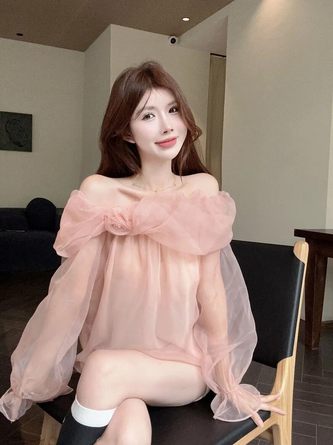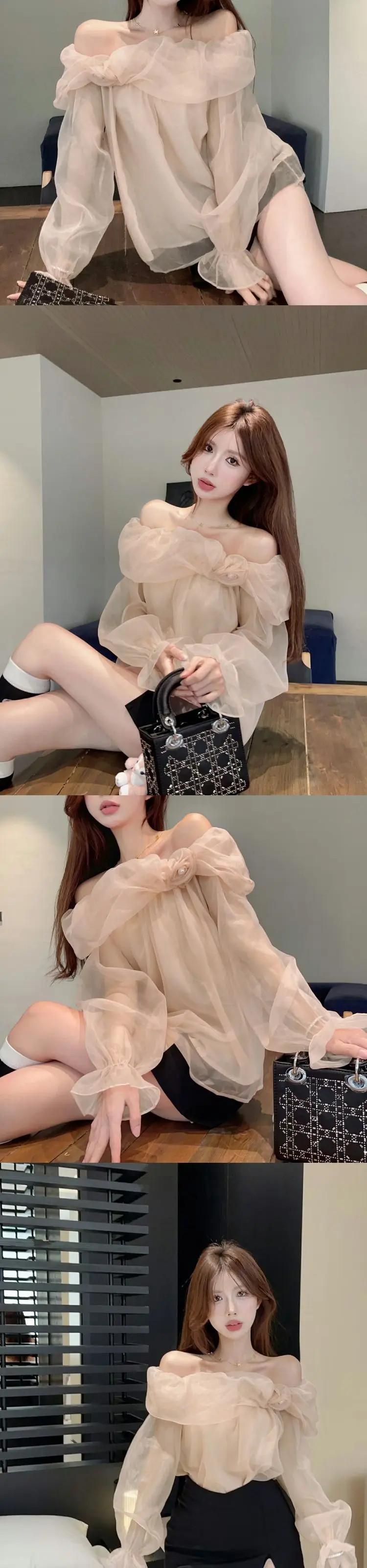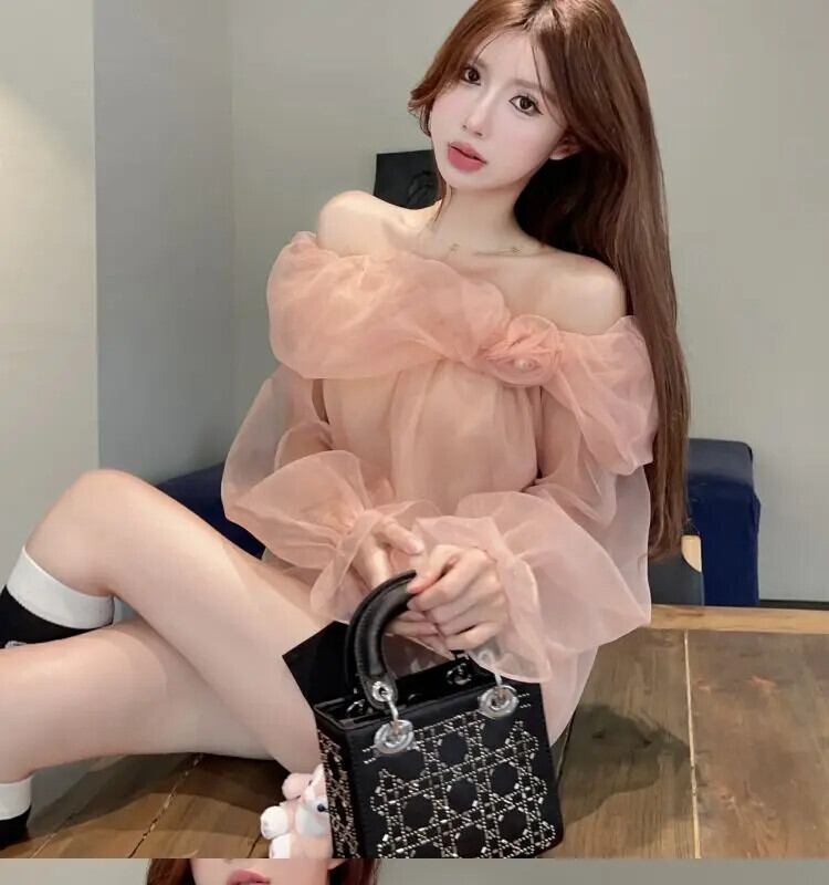 甘いホットガールオフショルダー長袖シャツ春純粋セクシースラッシュネックシフォンシャツトップ ロング 大人ガーリー スウィート キュート カジュアル スプリング 春物 ピュア