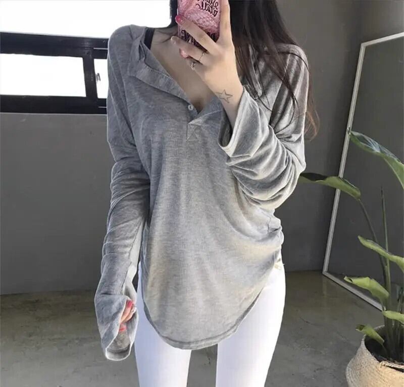 純粋セクシースタイルホットガールカーブ裾長袖 Tシャツ春ルーズ日焼け止めベースシャツ ロング スプリング 春物