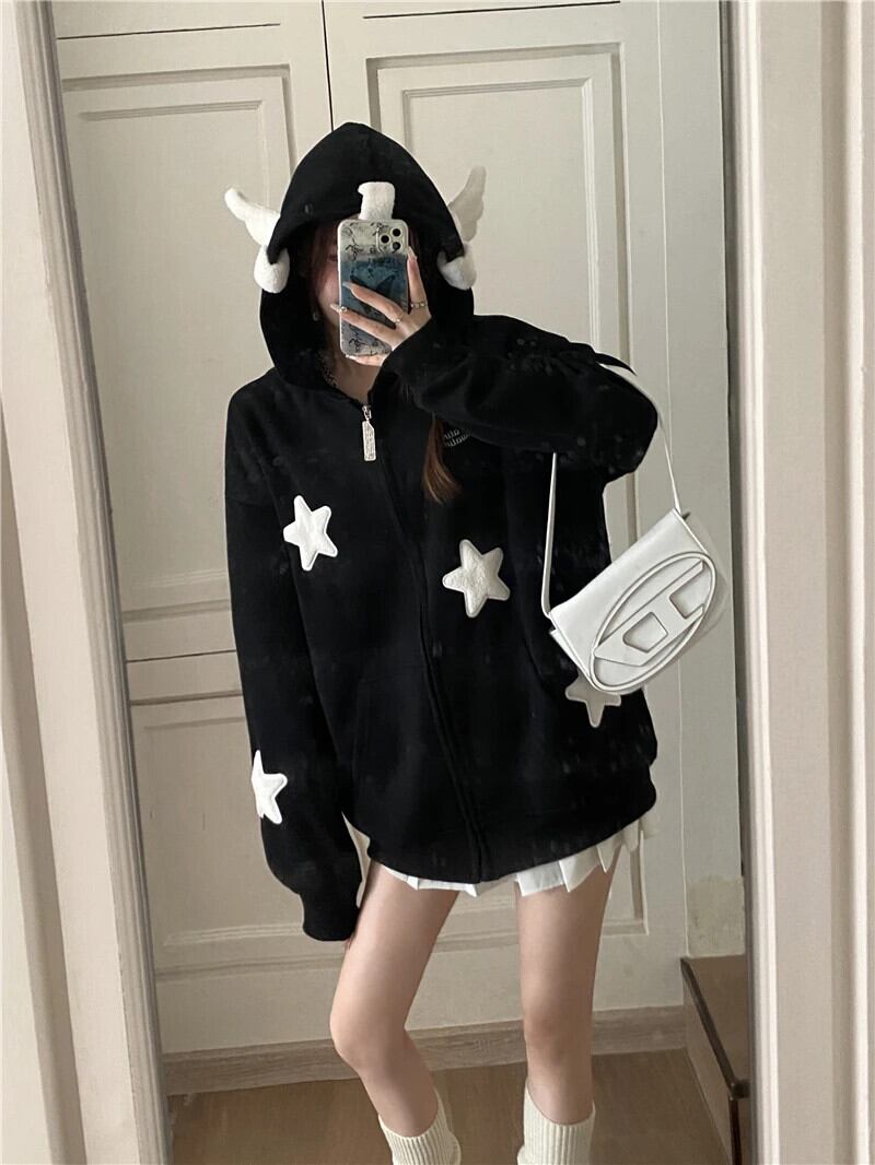 甘いホットガールスターウィングフード付きトレーナー冬長袖ルーズジッパーカーディガンジャケット ロング レッド 大人ガーリー スウィート キュート カジュアル ウィンター 冬物