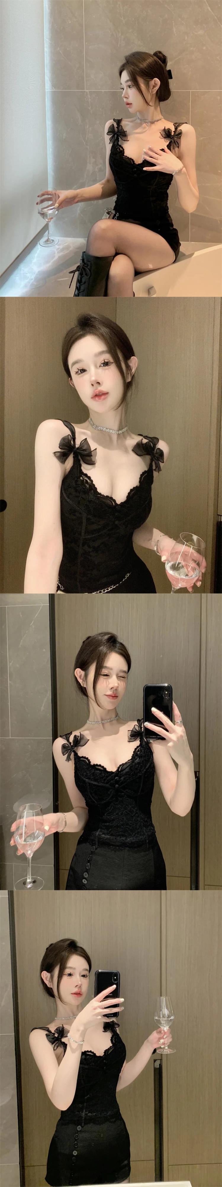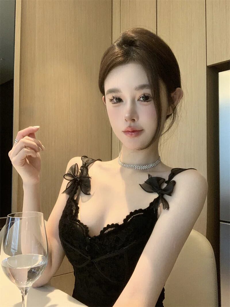 甘いホットガールメッシュボウレースキャミソールベスト春純粋セクシースリムフィットノースリーブストラップトップ リボン 大人ガーリー スウィート キュート カジュアル スプリング 春物 ピュア