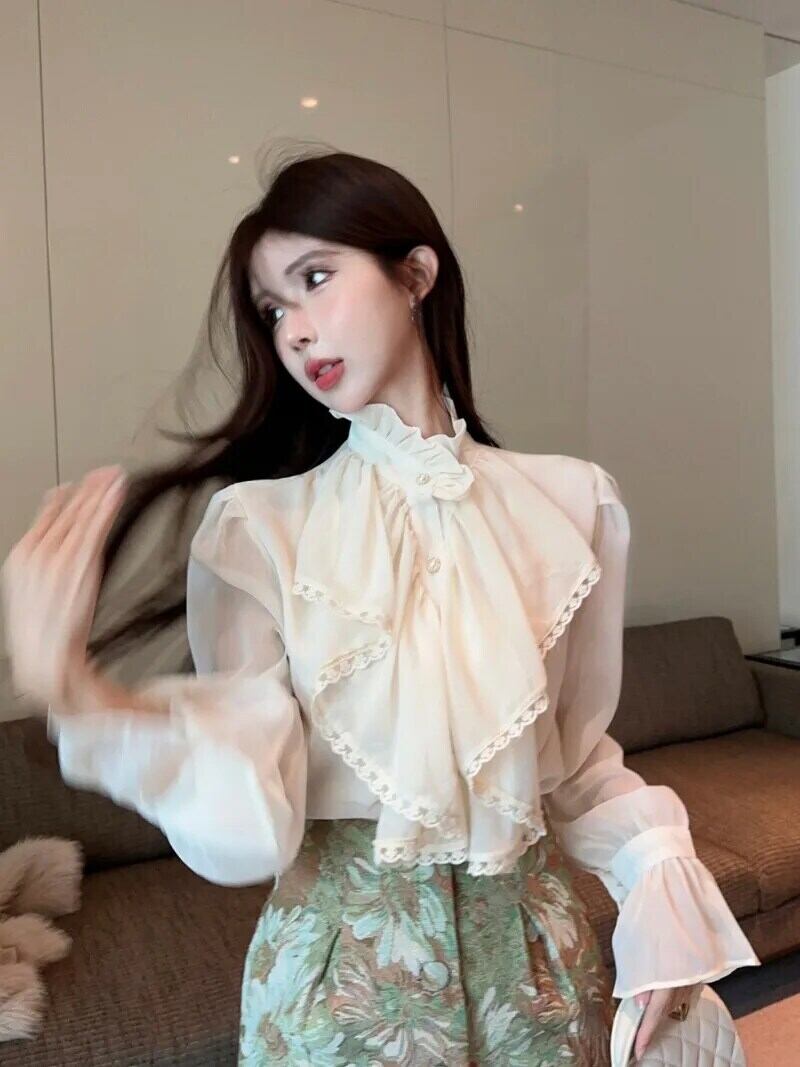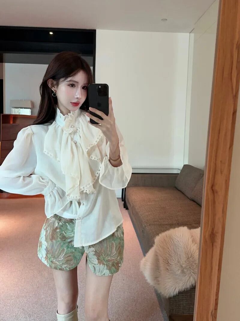 フレンチスイートガールスーツ秋フレア袖フリルシャツウエストジャガードミニスカートツーピースセット フレアスリーブ 大人ガーリー スウィート キュート カジュアル オータム 秋物