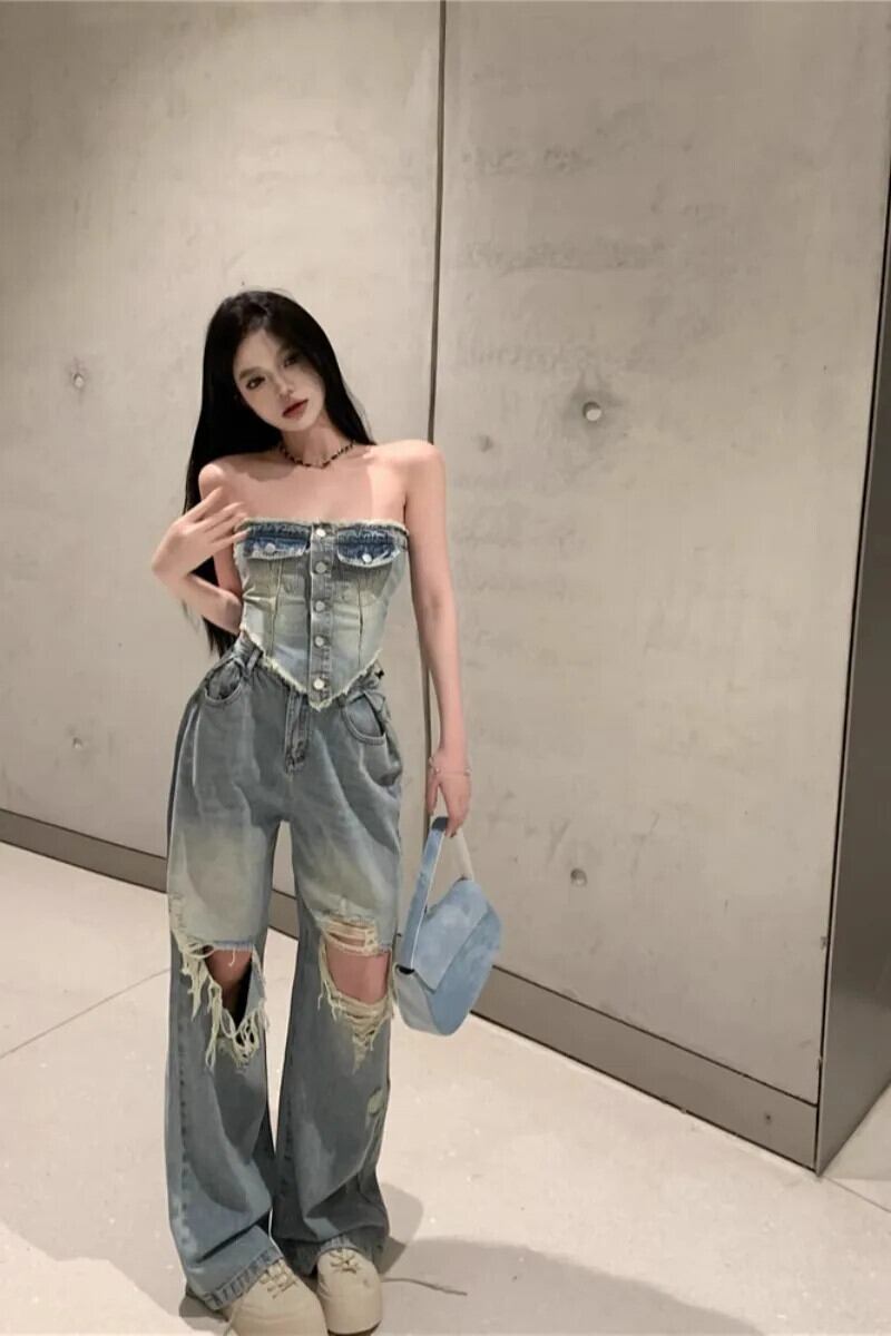 ホットガールアメリカンデニムスーツ秋/冬スリムフィットストラップレストップ Perated ジーンズ 2 点セット オータム 秋物 ウィンター 冬物