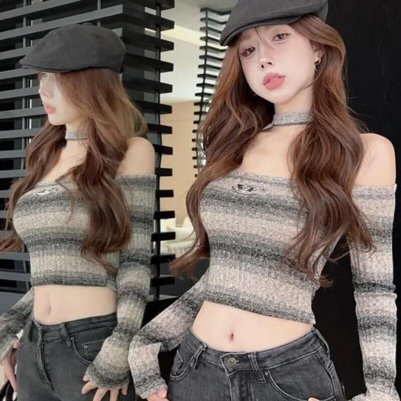 甘いホットガール純粋セクシーホルターネックニット秋スラッシュネック長袖タイトショートトップ ロング 大人ガーリー スウィート キュート カジュアル オータム 秋物 ピュア