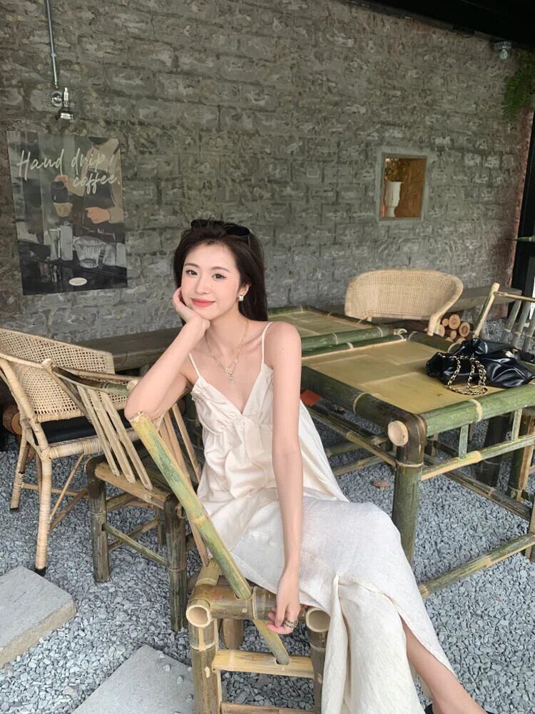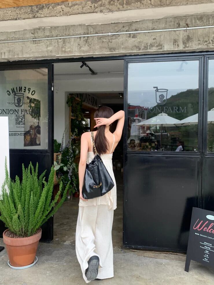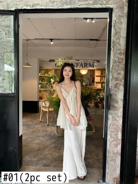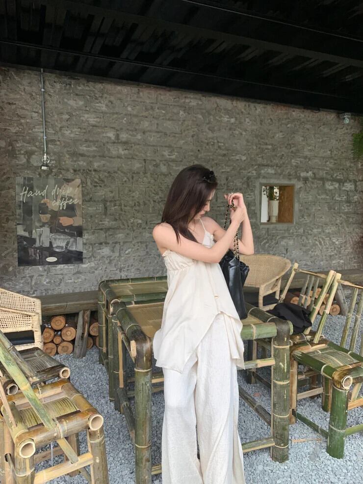 Sweet Hot Girl ベージュ スーツ レディース 春 イレギュラー V ネック ストラップ トップ ワイドレッグ パンツ 2 点セット 大人ガーリー スウィート キュート カジュアル スプリング 春物 Vネック ワイドパンツ