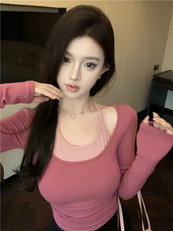 甘いホットガール偽ツーピースホルター Tシャツ春スリムフィット長袖底入れトップ ロング 大人ガーリー スウィート キュート カジュアル スプリング 春物