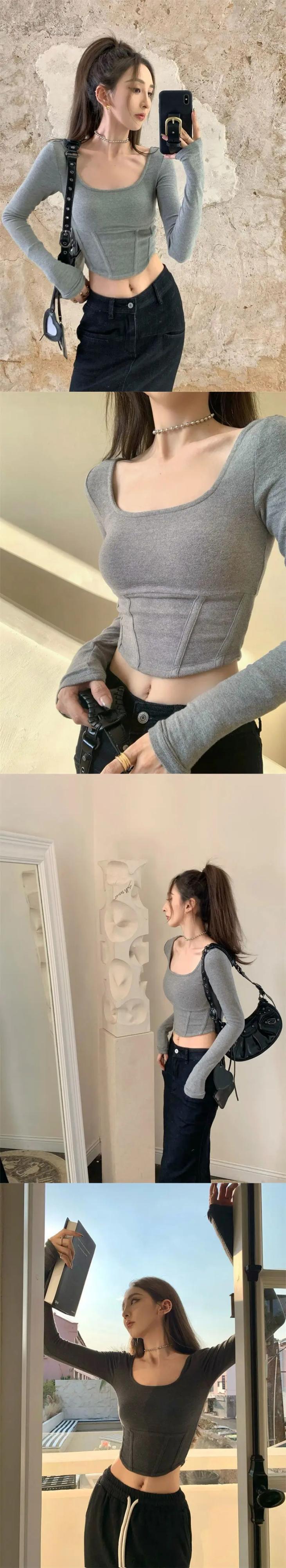 Sweet Girl グレースクエアカラー長袖 Tシャツ秋フィッシュボーンスリムフィットショートボトリングトップ ロング 大人ガーリー スウィート キュート カジュアル オータム 秋物 スクウェア