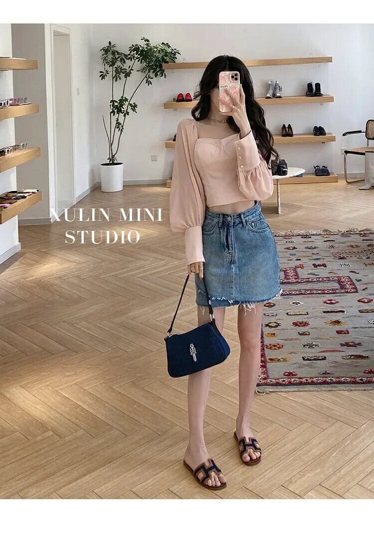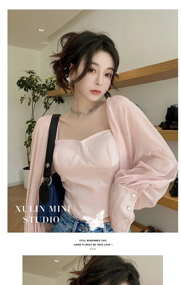 フレンチスイートホットガールスクエアカラーシフォントップ夏純粋セクシー長袖スリムフィットショートトップ ロング 大人ガーリー スウィート キュート カジュアル サマー 夏物 ピュア スクウェア