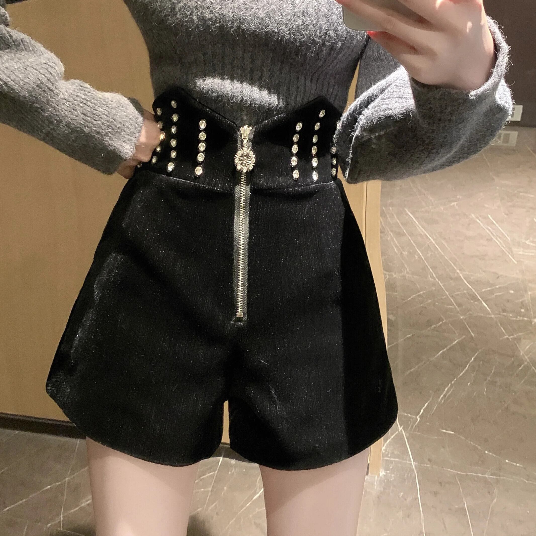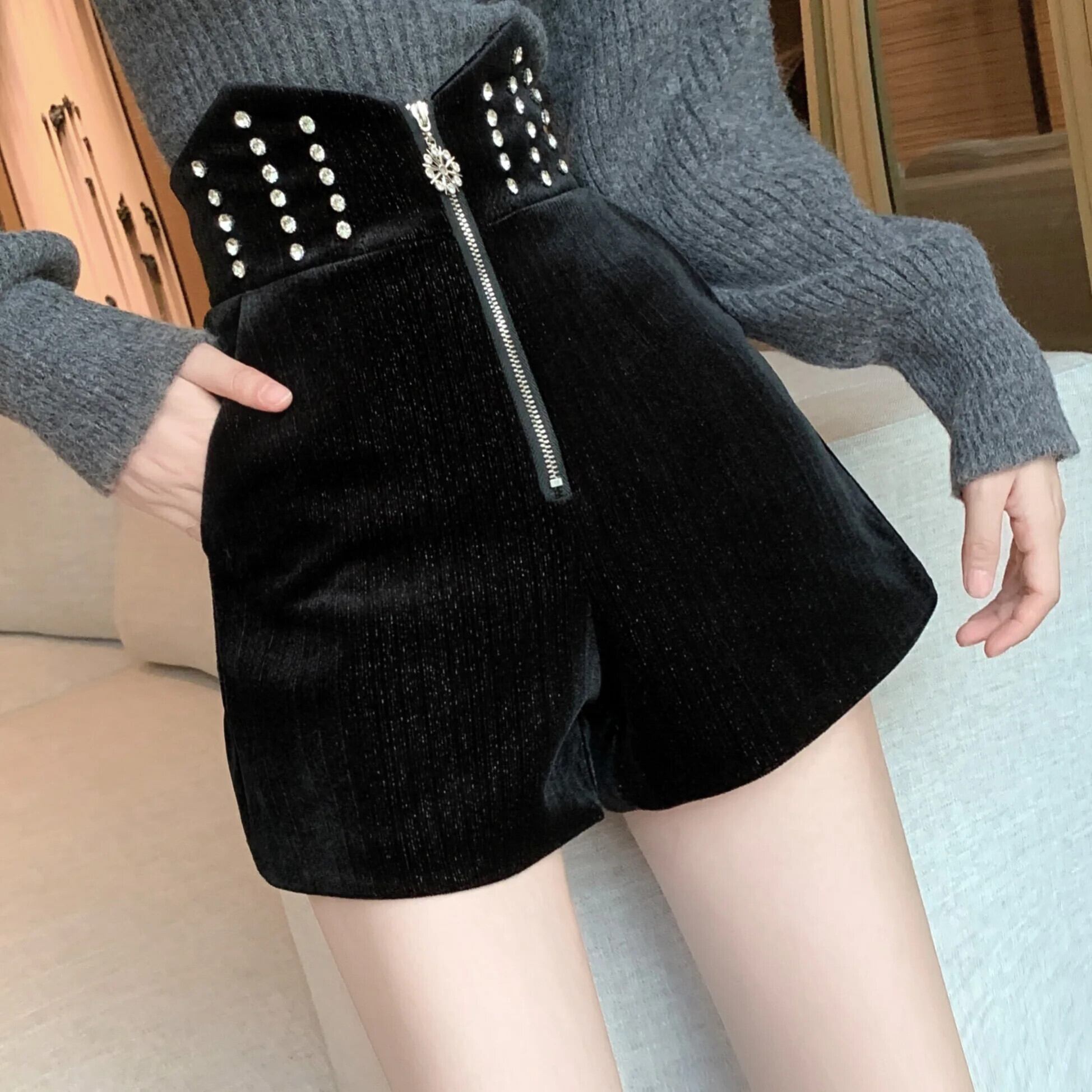 Sweet Girl ブラックベルベットショーツ秋/冬ウエスト不規則ジッパーワイドレッグパンツ レッド 大人ガーリー スウィート キュート カジュアル オータム 秋物 ウィンター 冬物 ブルマー ワイドパンツ