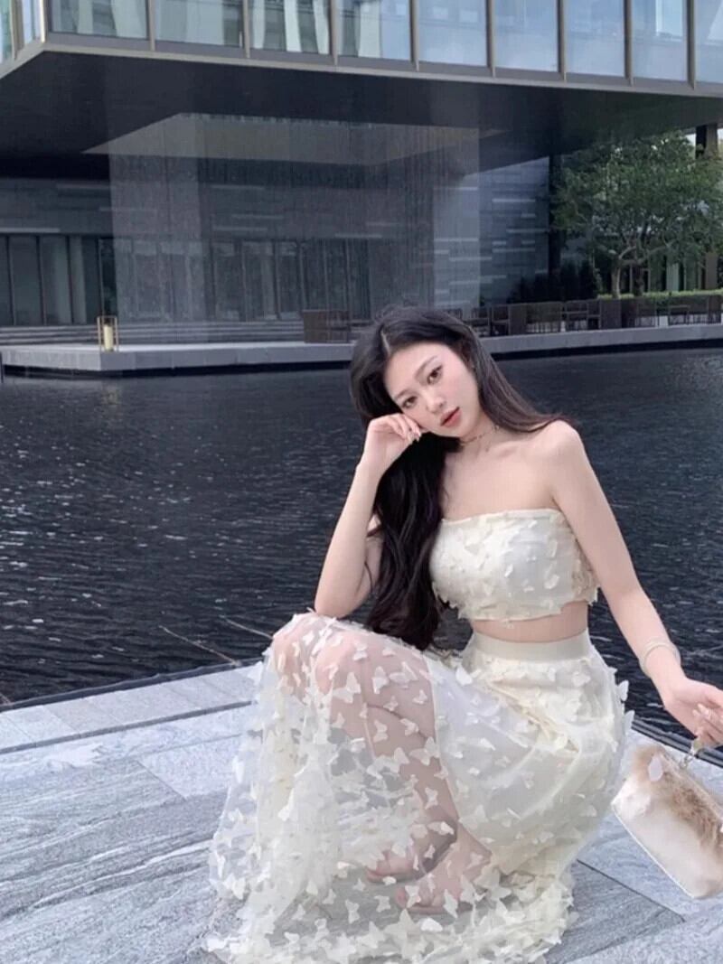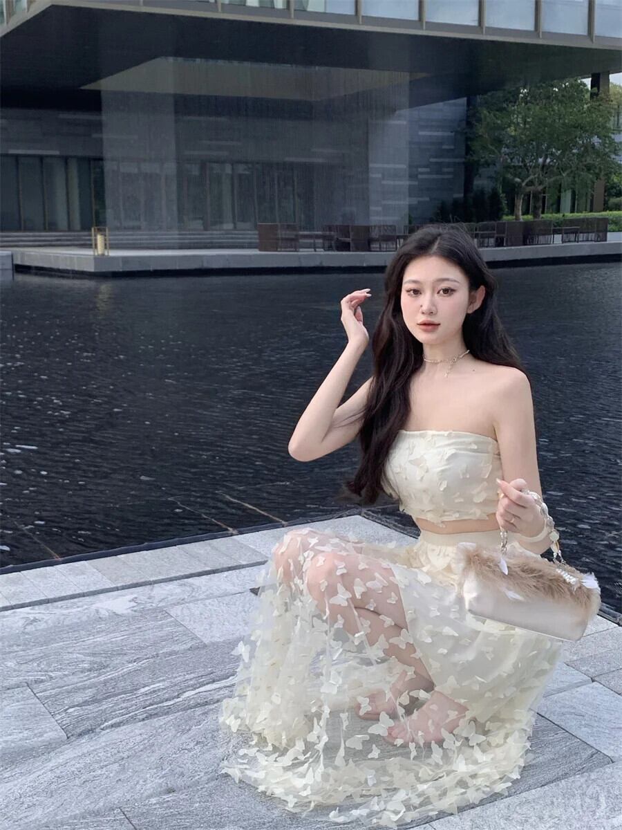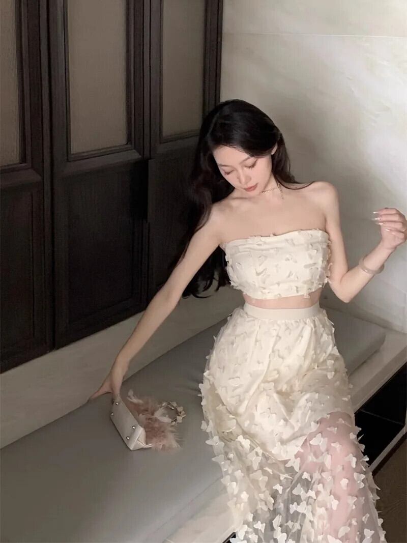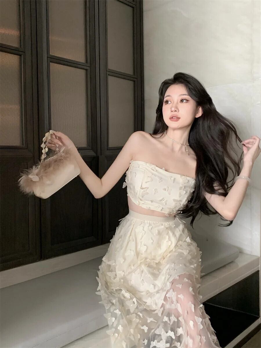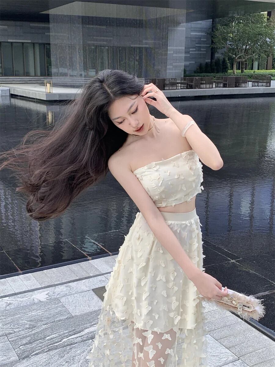 甘いホットガールスーツ春立体蝶ストラップレスベストメッシュ A ラインスカート 2 点セット 大人ガーリー スウィート キュート カジュアル スプリング 春物 Aライン