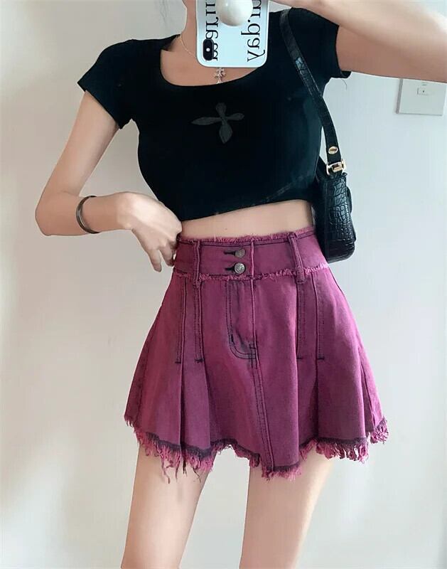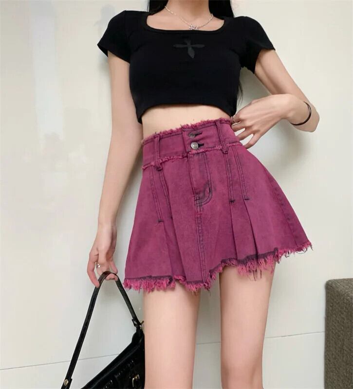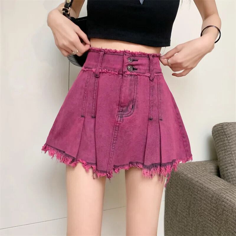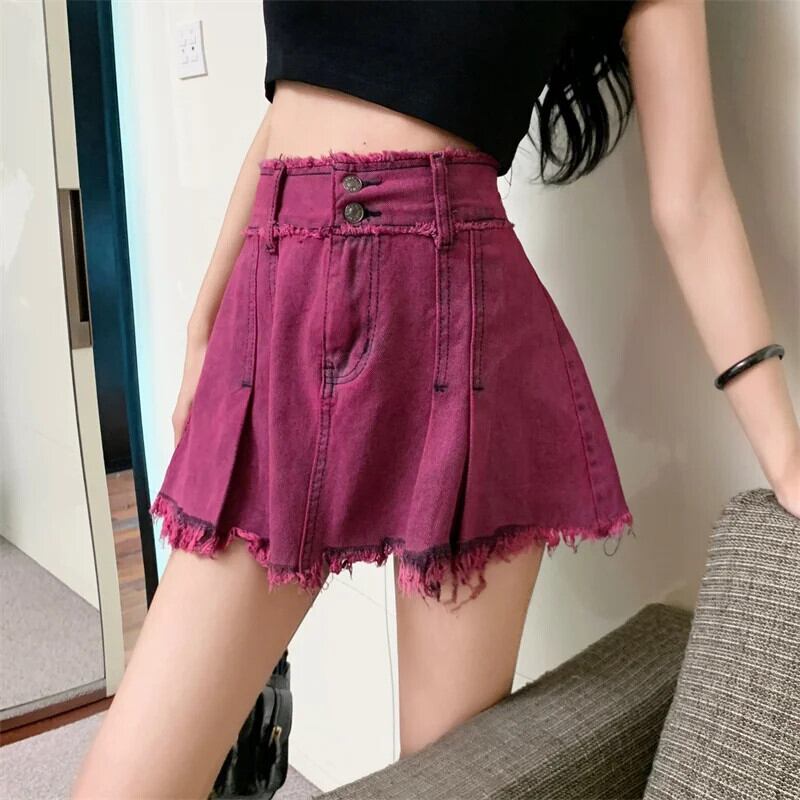 アメリカンスウィートホットガールウエストデニムショートスカートレディース春夏ダブルボタンぬいぐるみエッジウォッシュAラインミニスカート 大人ガーリー キュート カジュアル スプリング 春物 サマー 夏物