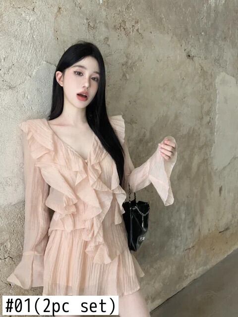 スイートガールスーツ レディース 春 フリル 長袖シャツ ウエスト Aライン ショートスカート 2点セット ロング ラッフル 大人ガーリー スウィート キュート カジュアル スプリング 春物