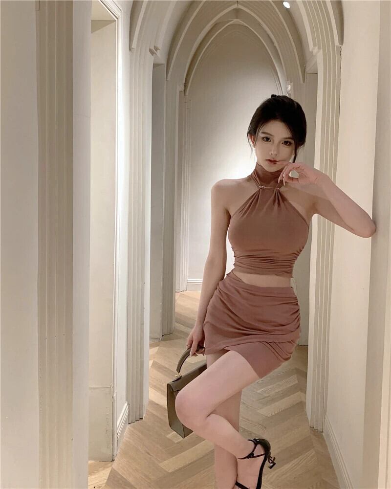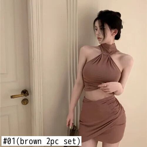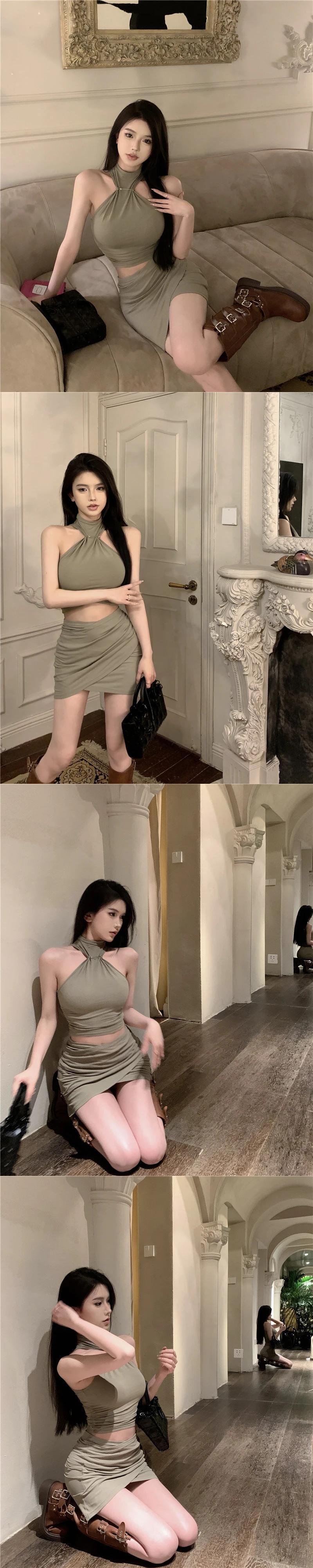 アメリカンスウィートホットガールスーツ レディース オフショルダー ホルターネック ノースリーブ タンクトップ ウエスト プリーツ ラップ ヒップ スカート 2点セット 大人ガーリー キュート カジュアル