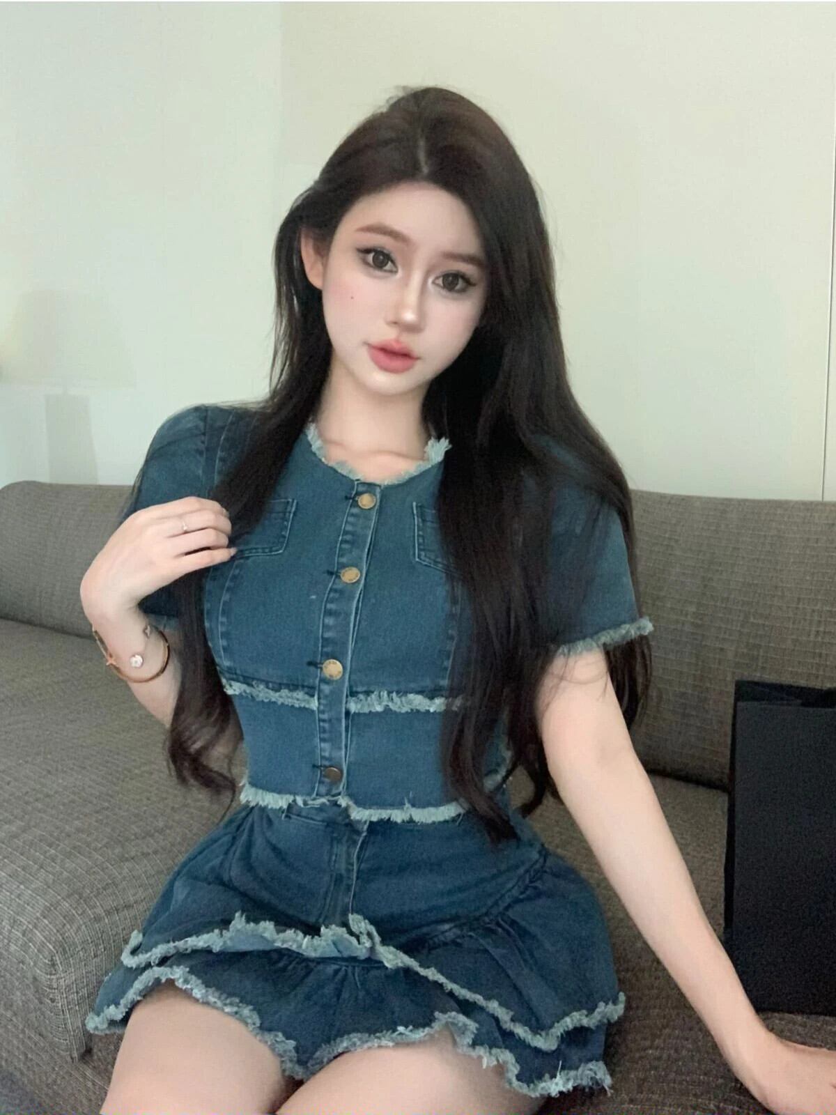 甘いホットガールスーツ夏長袖デニムトップウエスト A ラインミニスカート 2 点セット ロング 大人ガーリー スウィート キュート カジュアル サマー 夏物 Aライン