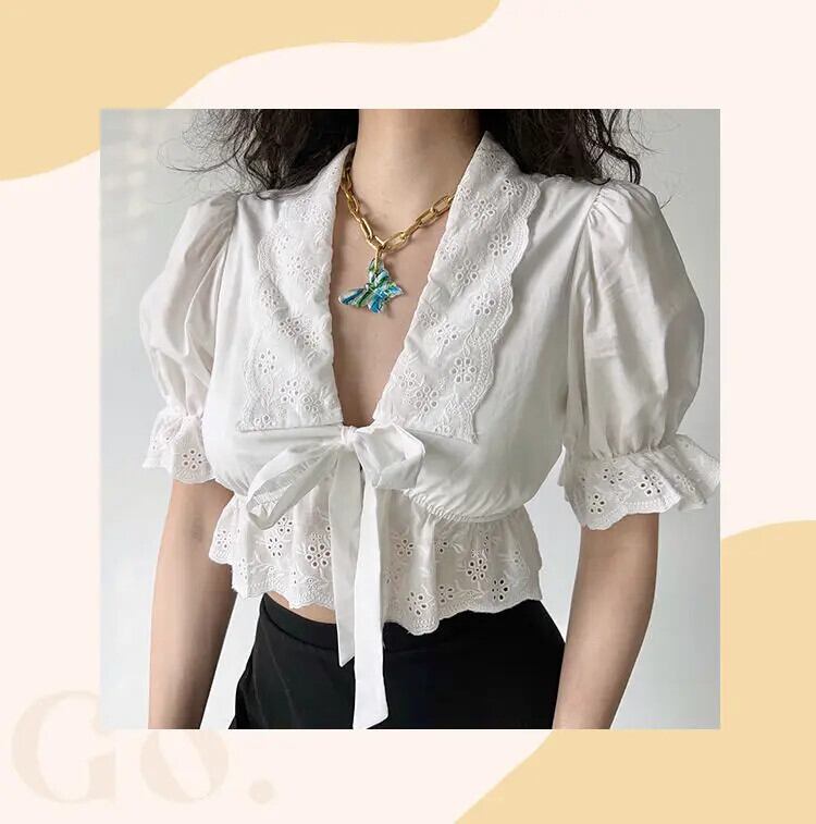 フレンチスイートホットガールバブルスリーブ刺繍シャツ春夏レースセクシーホワイトショートトップ レッド 大人ガーリー スウィート キュート カジュアル スプリング 春物 サマー 夏物