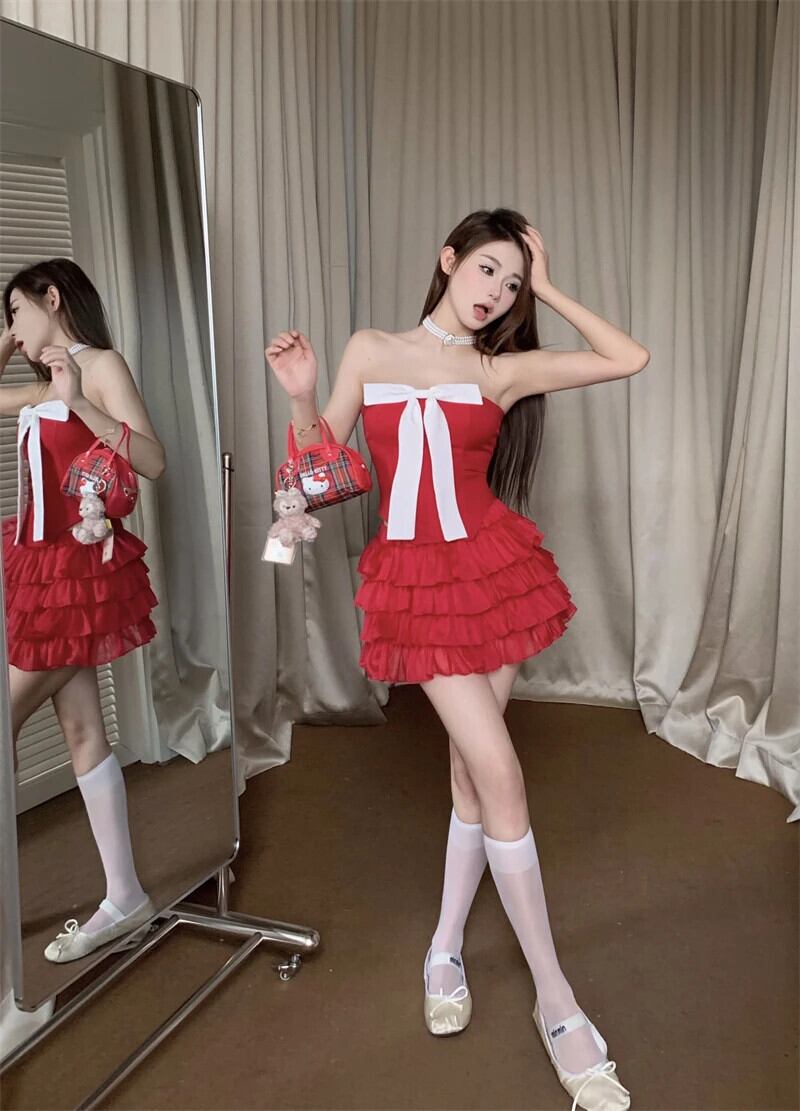 スイートガールスーツ春/夏弓スリムフィットストラップレスタンクトップウエストケーキスカートツーピースセット リボン 大人ガーリー スウィート キュート カジュアル スプリング 春物 サマー 夏物
