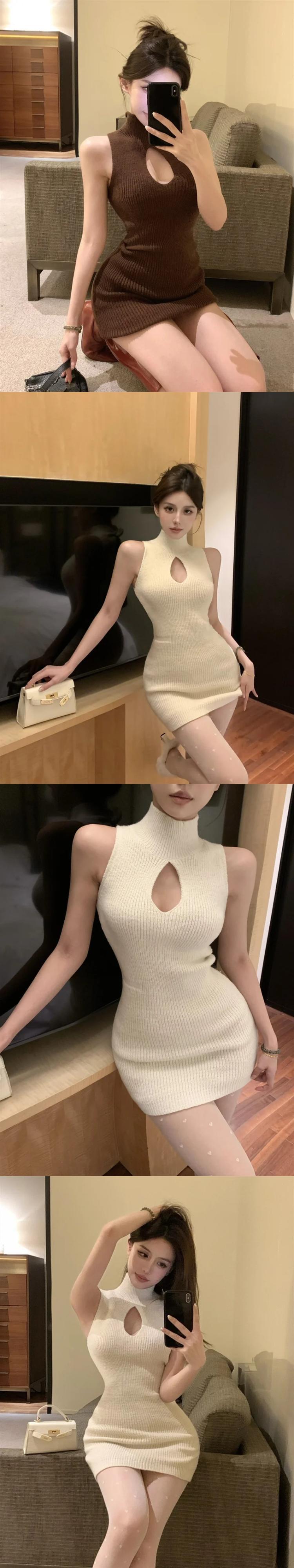 甘いホットガールハーフネックノースリーブニットドレス秋と冬タイトフィットヒップラップショートドレス 大人ガーリー スウィート キュート カジュアル オータム 秋物 ウィンター 冬物