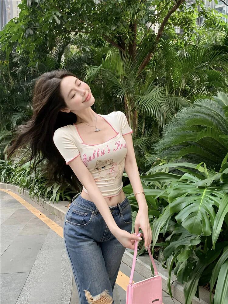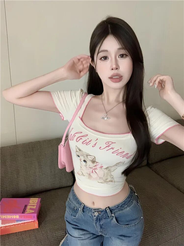 アメリカンスウィートホットガールキャットプリントスクエアカラーTシャツ夏半袖スリムフィットトップ 大人ガーリー キュート カジュアル サマー 夏物 スクウェア