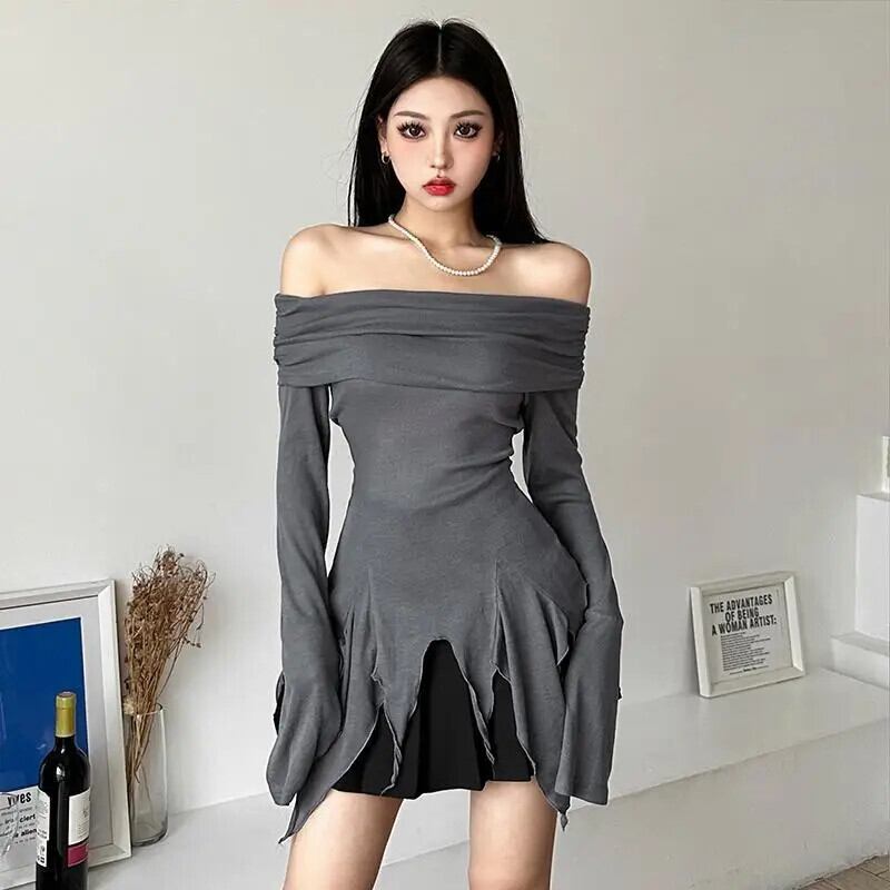 フレンチスイートホットガールソリッドスラッシュネックオフショルダートップ春と秋不規則長袖Tシャツ ロング 大人ガーリー スウィート キュート カジュアル スプリング 春物 オータム 秋物 ソリッドカラー