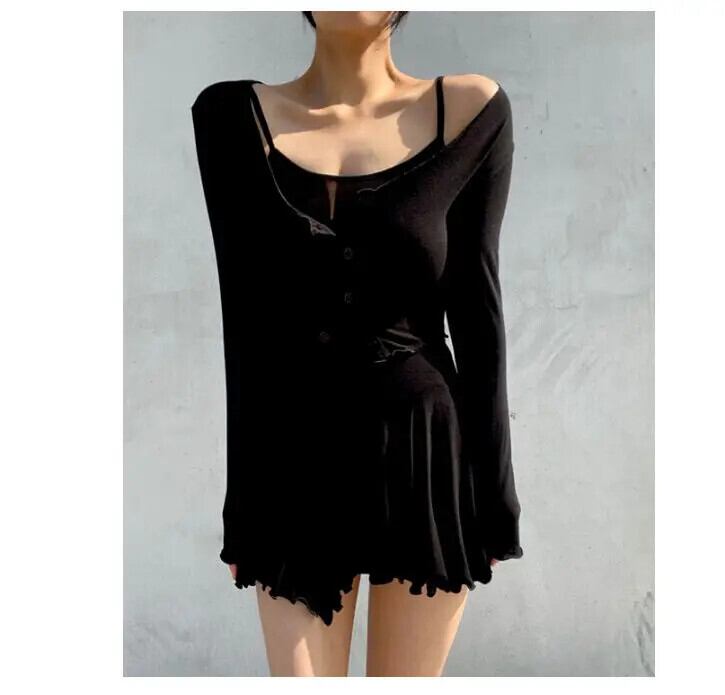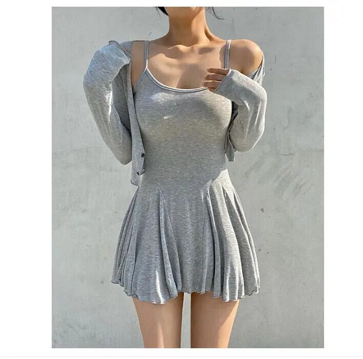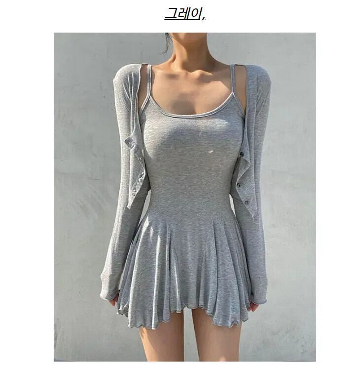 甘いホットガール純粋セクシースーツ春スリムフィットストラップドレス長袖カーディガンツーピースセット ロング 大人ガーリー スウィート キュート カジュアル スプリング 春物 ピュア