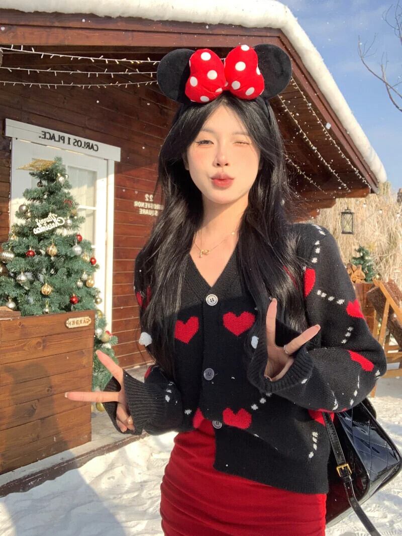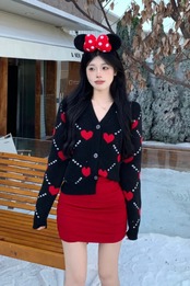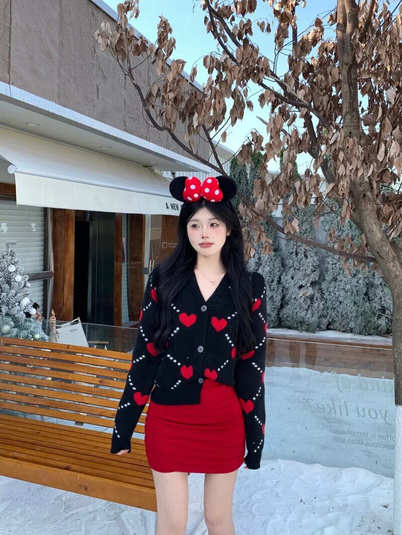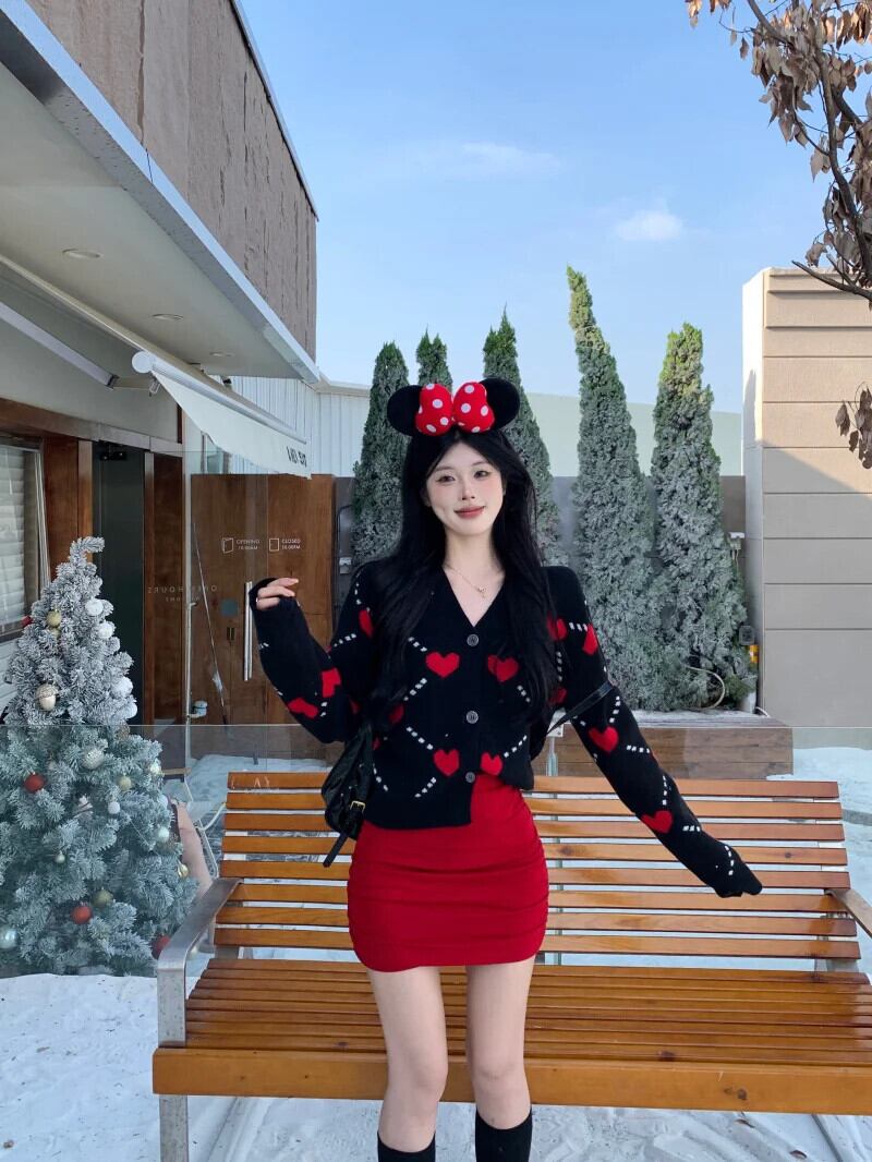 甘いホットガール秋/冬 V ネックニットカーディガンファーレッドプリーツラップヒップスカート 2 点セット 大人ガーリー スウィート キュート カジュアル オータム 秋物 ウィンター 冬物 Vネック