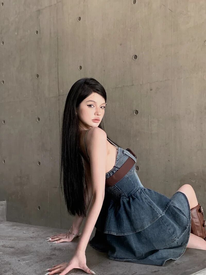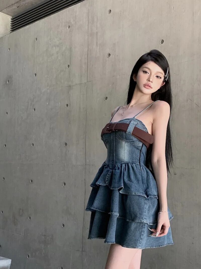 甘いホットガールレトロデニムストラップドレス夏純粋セクシースリムフィット A ラインふわふわショートドレス 大人ガーリー スウィート キュート カジュアル サマー 夏物 Aライン ピュア