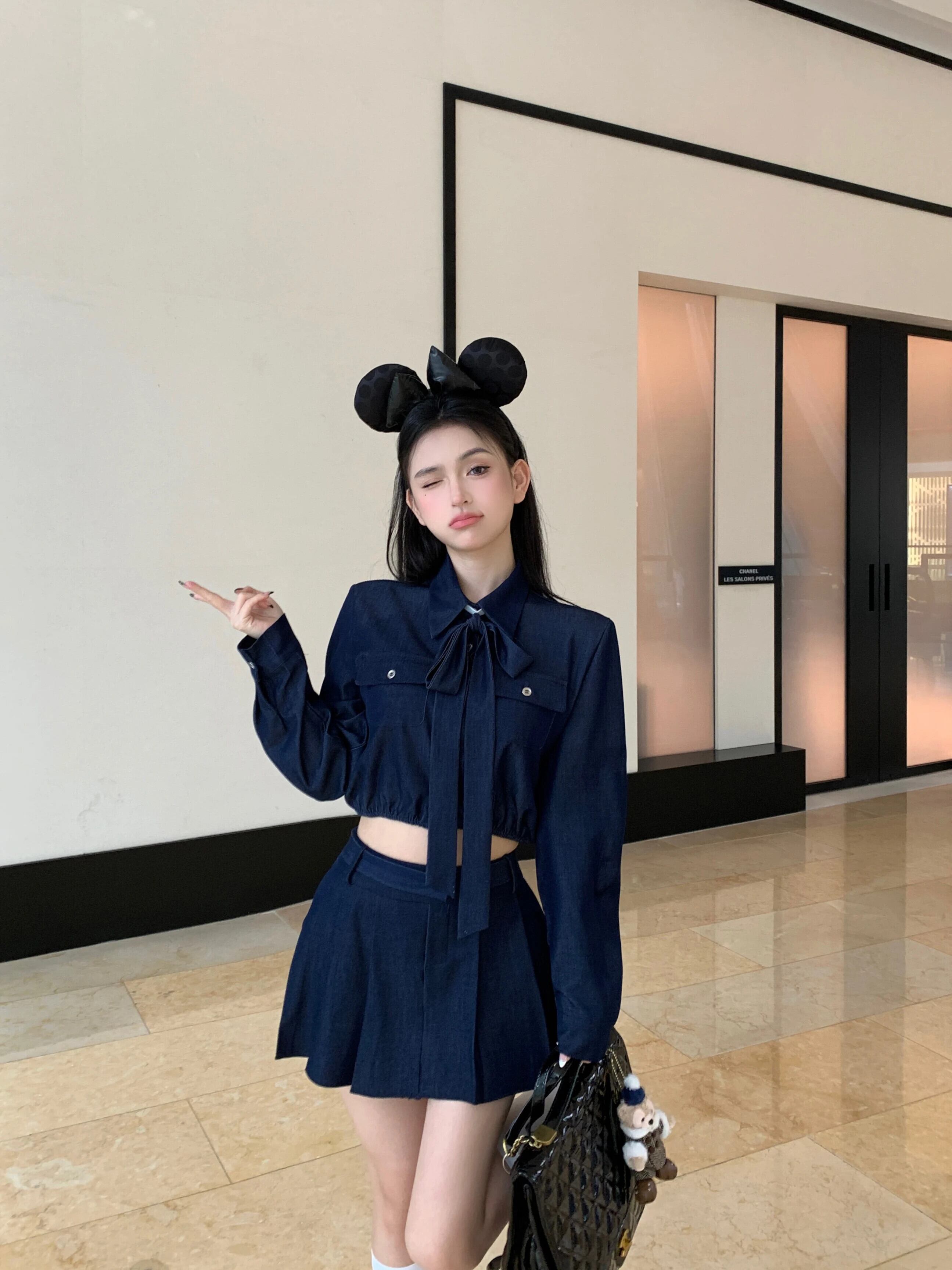 フレンチスイートホットガールスーツ春長袖リボンシャツトップウエストAラインミニスカートツーピースセット ロング 大人ガーリー スウィート キュート カジュアル スプリング 春物