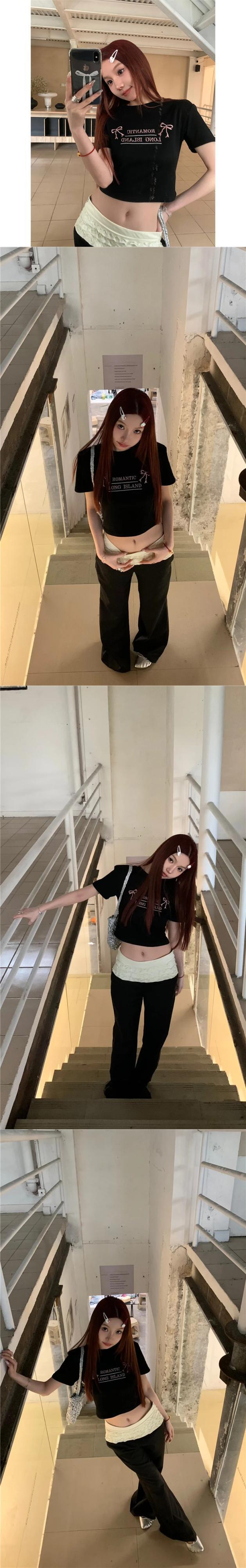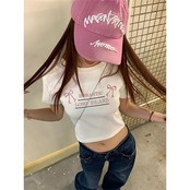 American Sweet Girl リボン半袖 Tシャツ夏レター刺繍 O ネックスリムフィットショートトップ レッド 大人ガーリー スウィート キュート カジュアル サマー 夏物 Oネック