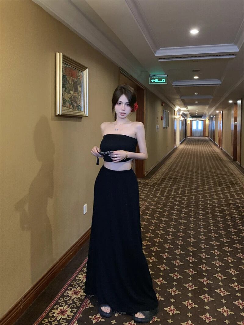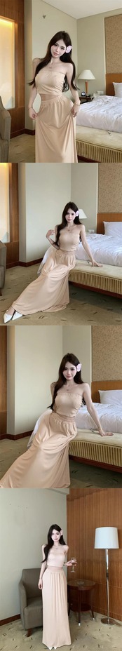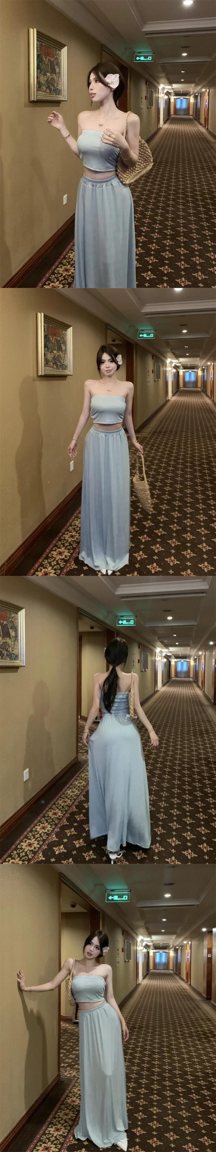 純粋セクシー甘いホットガールスーツ春プリーツストラップレスベスト弾性ウエストスカートツーピースセット エラスティック 伸縮 大人ガーリー スウィート キュート カジュアル スプリング 春物