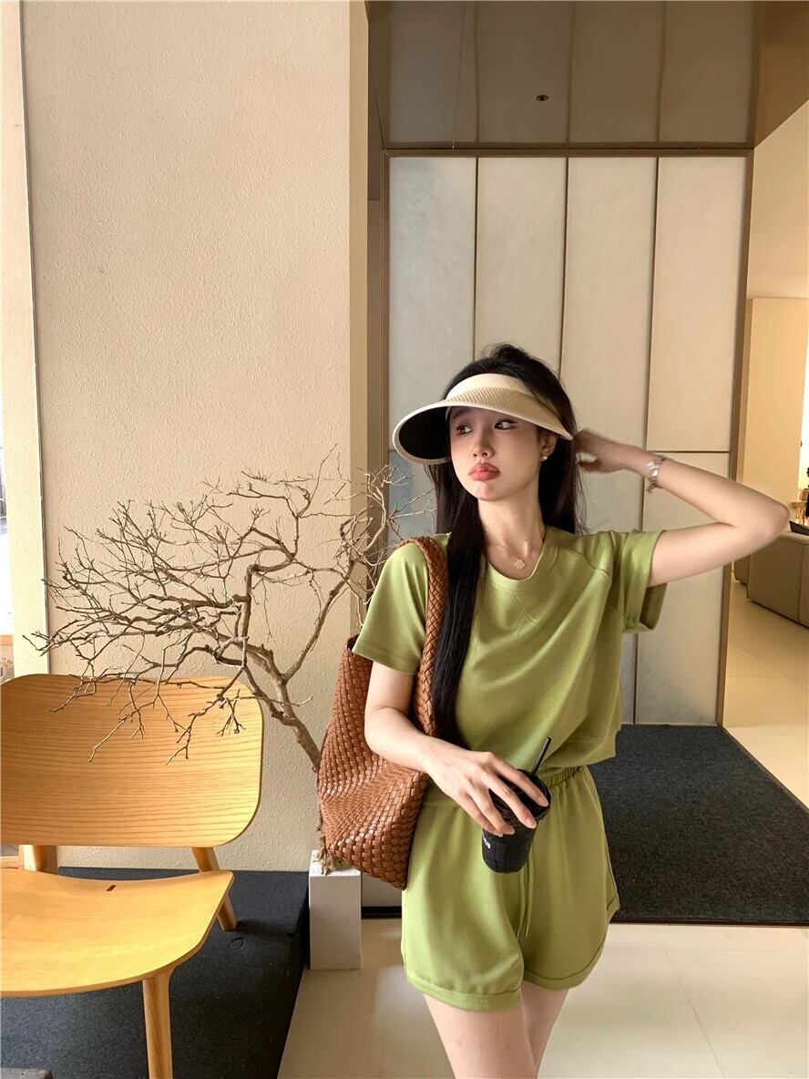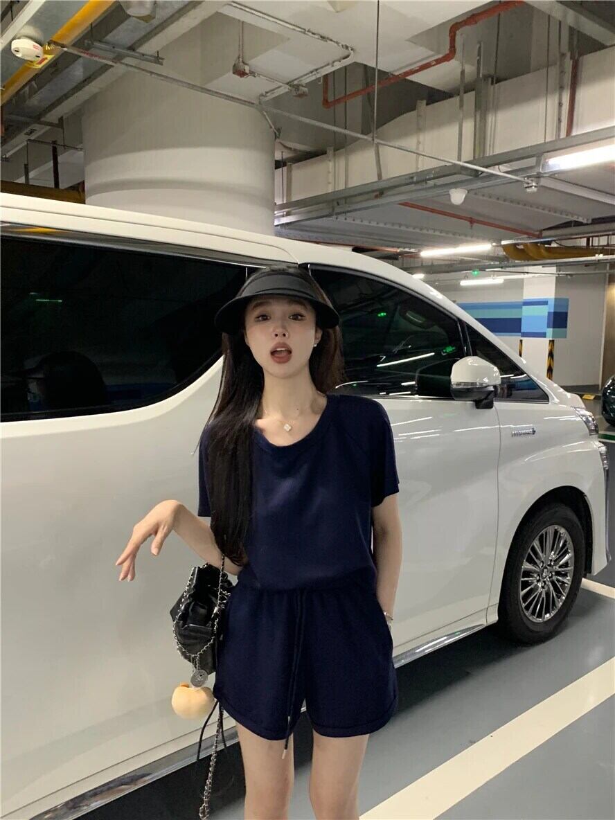 ホットガールスーツ レディース 夏 Oネック 半袖 Tシャツ トップス 巾着 ワイドレッグ Aライン ショーツ 2点セット サマー 夏物 ブルマー ワイドパンツ