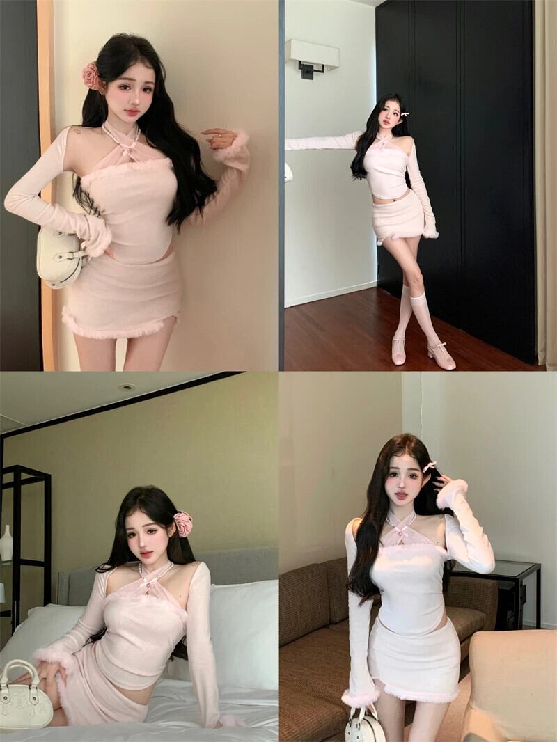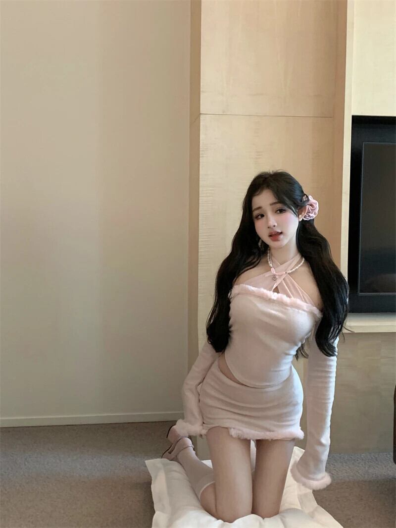 ホットガール純粋セクシースーツ春長袖ニットカーディガンホルターネックタンクトップミニスカート 3 点セット ロング スプリング 春物 ピュア