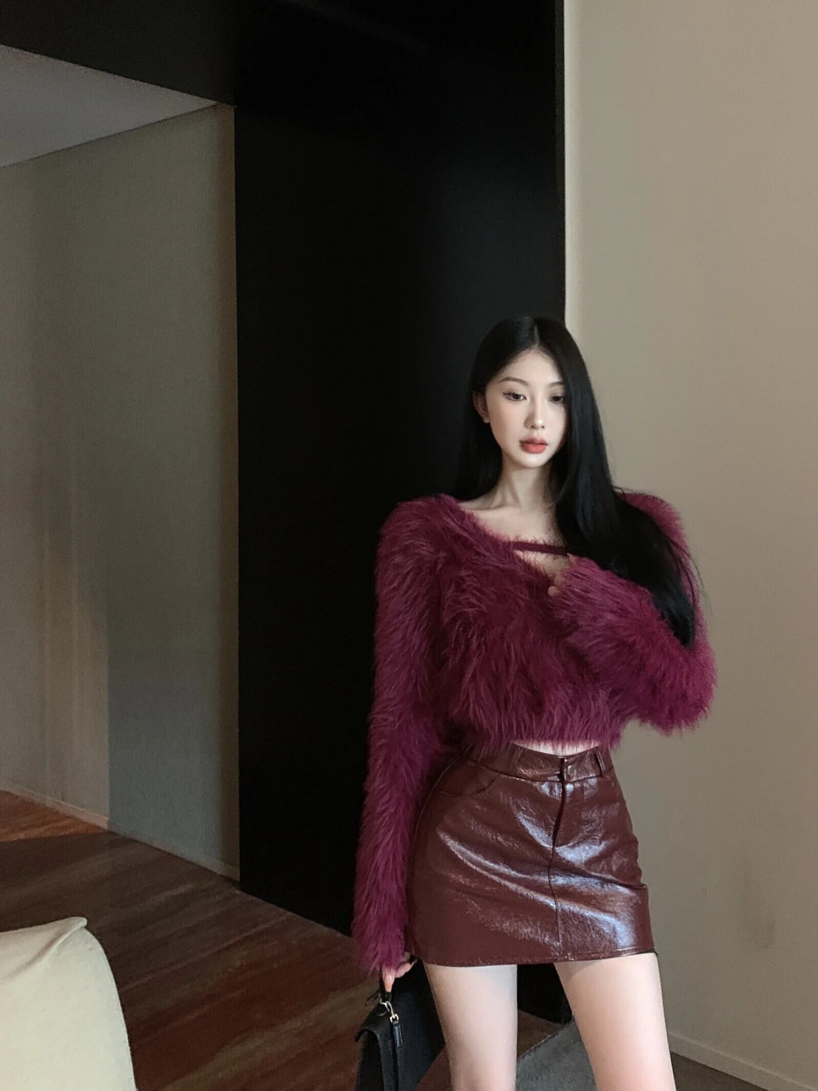 Sweet Girl 純粋セクシースーツ春モヘア V ネックセーターラップヒップミニ PU スカート 2 点セット 大人ガーリー スウィート キュート カジュアル スプリング 春物 Vネック ピュア
