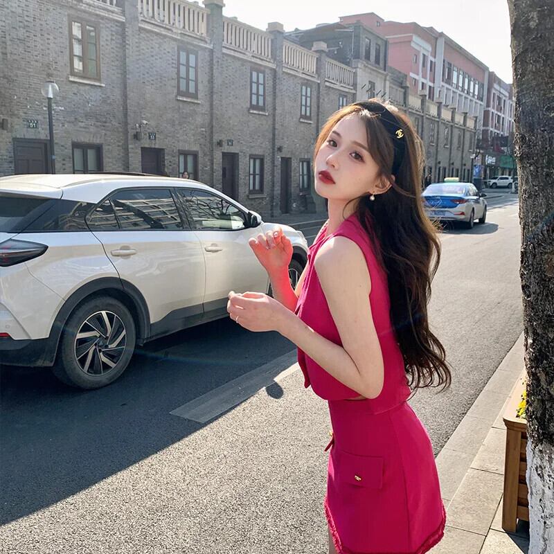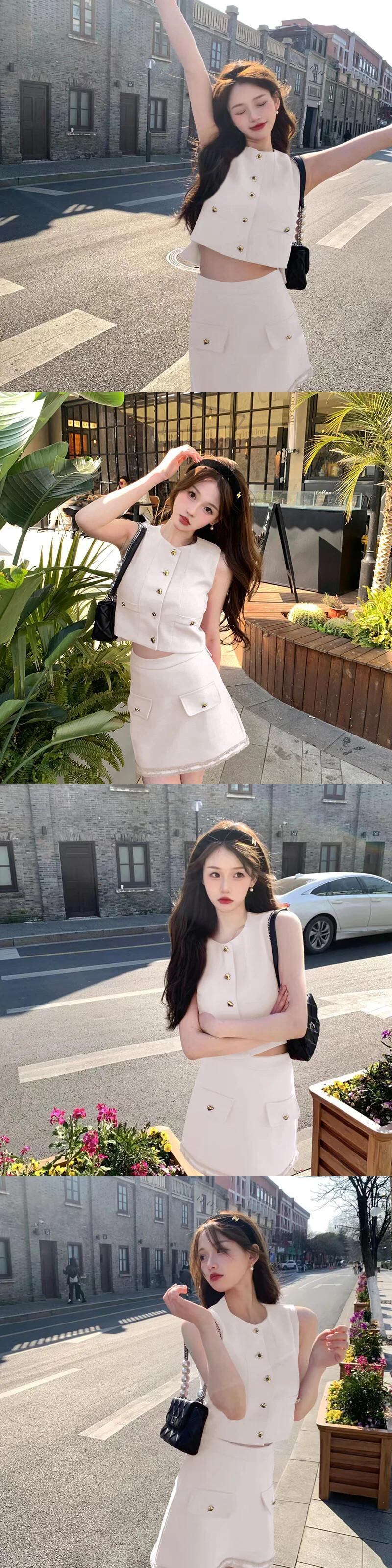 甘いホットガールスーツ夏休みスタイルノースリーブ O ネックベストウエストミニスカート 2 点セット 大人ガーリー スウィート キュート カジュアル サマー 夏物 Oネック