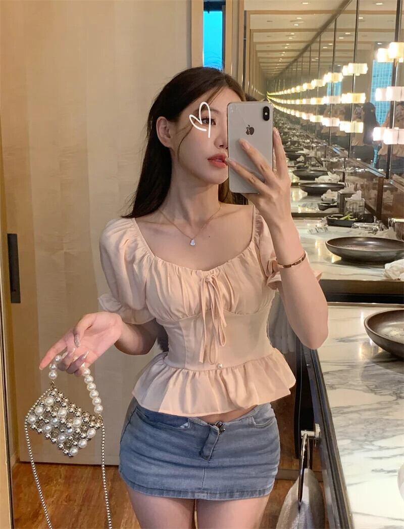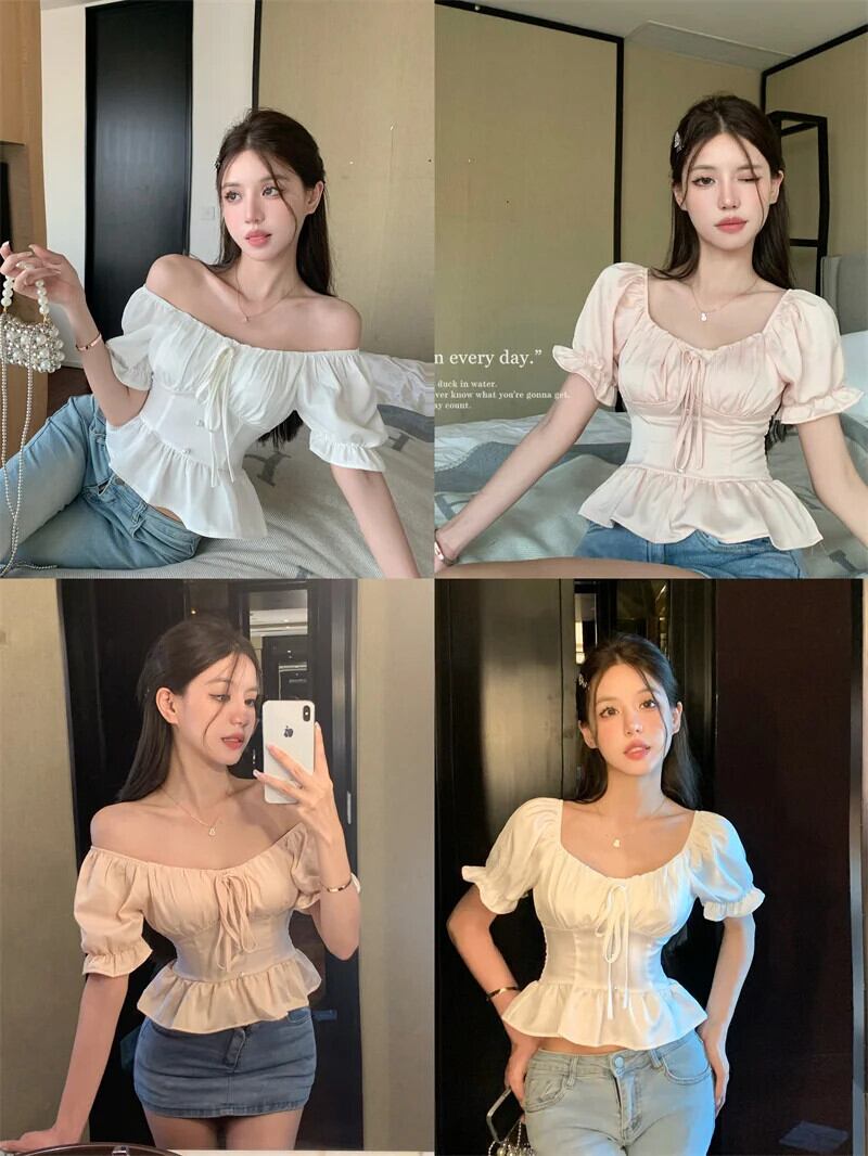 甘いホットガール弓オフショルダー半袖シャツ夏レースアップフリルシャツスリムショートトップ リボン 大人ガーリー スウィート キュート カジュアル サマー 夏物