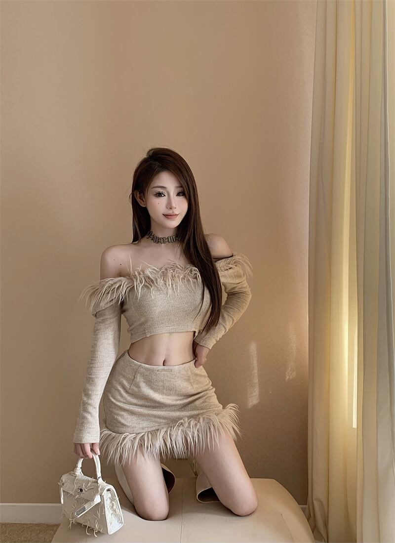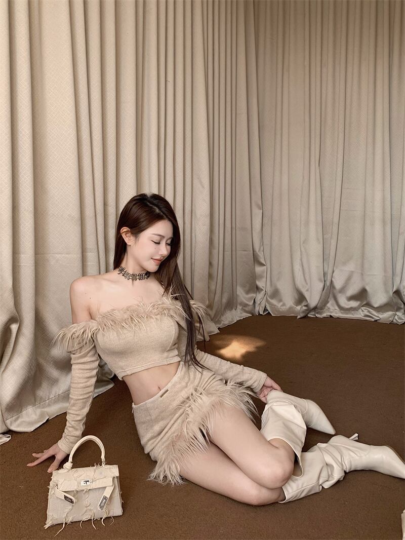 ホットガール純粋セクシースーツ冬オフショルダースリムショートトップウエストミニスカートツーピースセットfashuion ウィンター 冬物 ピュア