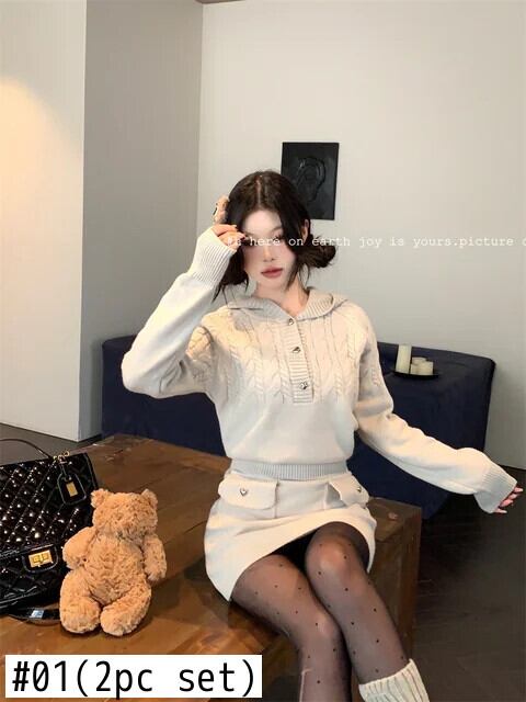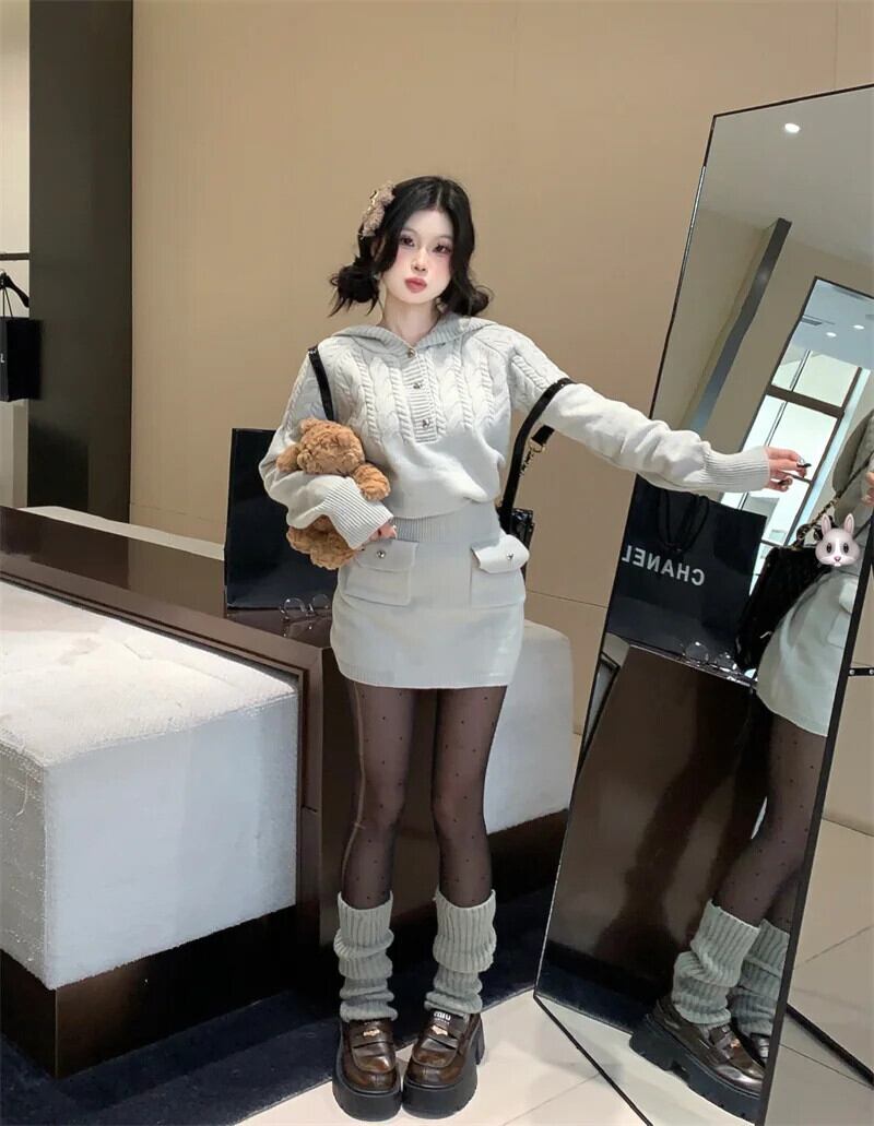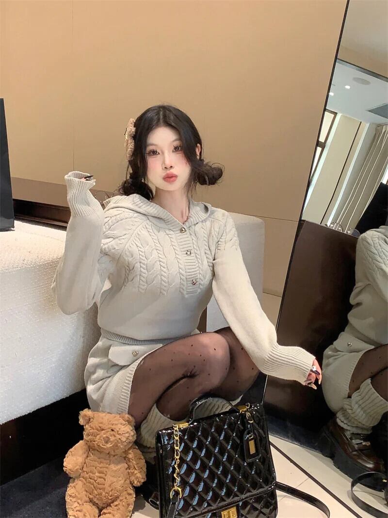 甘いホットガールスーツ冬グレーフード付きツイストセーター弾性ウエストラップヒップスカートツーピースセット エラスティック 伸縮 大人ガーリー スウィート キュート カジュアル ウィンター 冬物