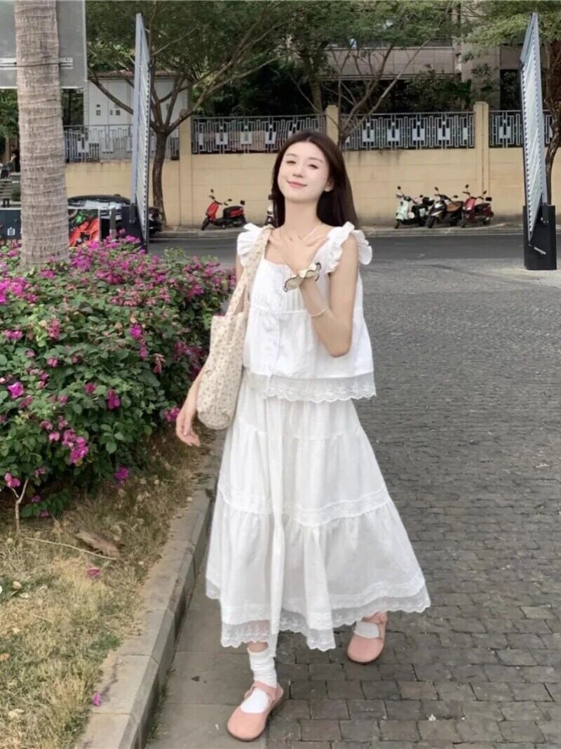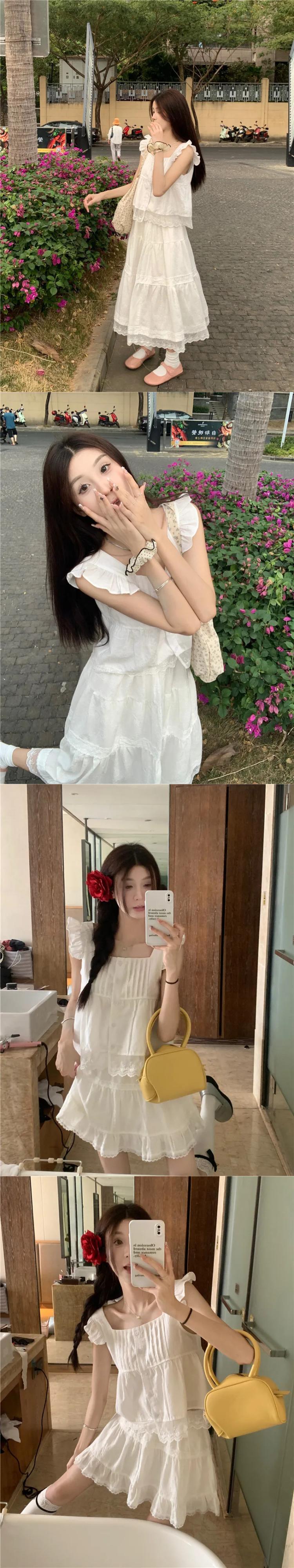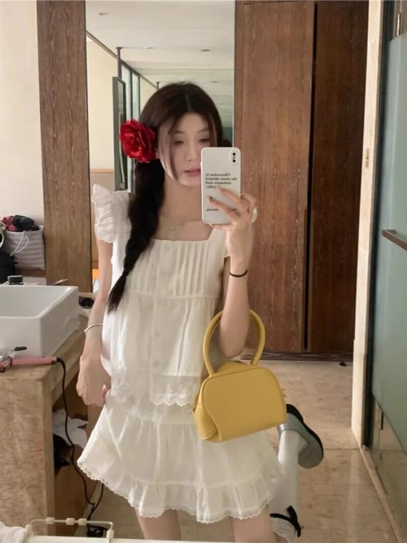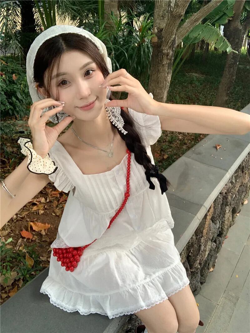 甘いホットガールスーツ春レースパッチワークフライングスリーブシャツウエストショートスカートツーピースセット 大人ガーリー スウィート キュート カジュアル スプリング 春物