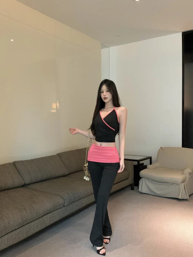 アメリカンホットガールスーツ春ホルターネックキャミソールベスト対照的カラーフレアパンツツーピースセット レッド スプリング 春物