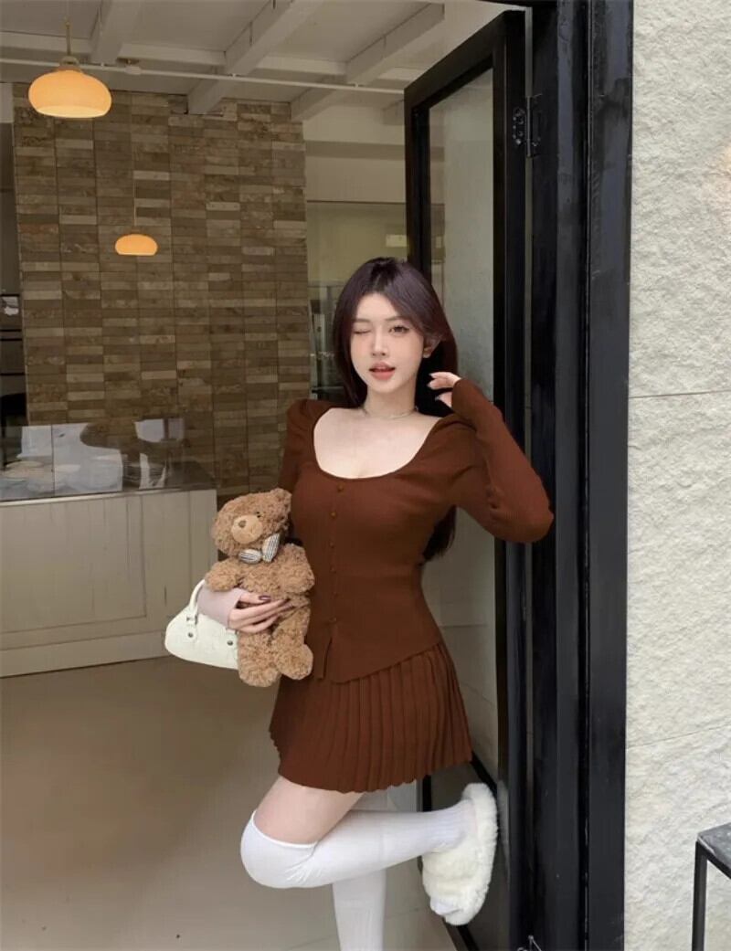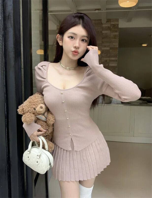 甘いホットガールスーツ秋 U ネックバブルスリーブセーターミニプリーツスカート 2 点セット 大人ガーリー スウィート キュート カジュアル オータム 秋物