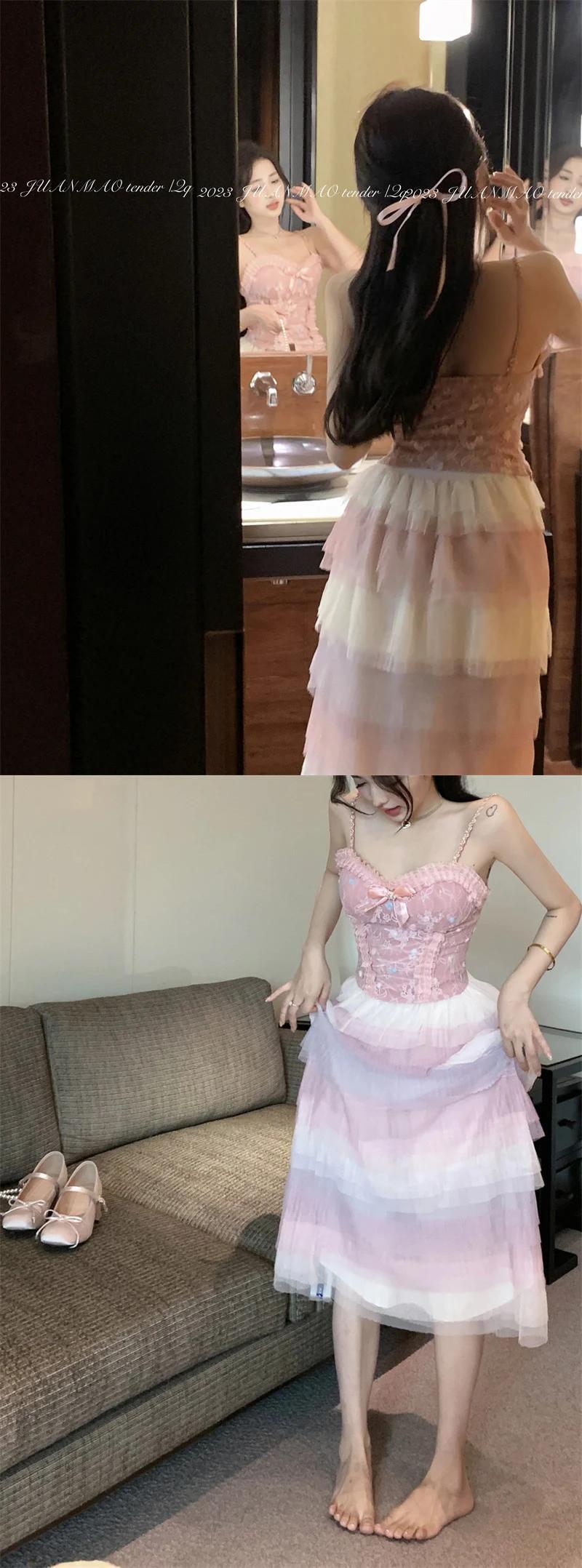 甘いホットガールスーツ春弓メッシュ食用木菌ストラップタンクトップウエストグラデーション A ラインスカート 2 点セット リボン 大人ガーリー スウィート キュート カジュアル スプリング 春物 Aライン