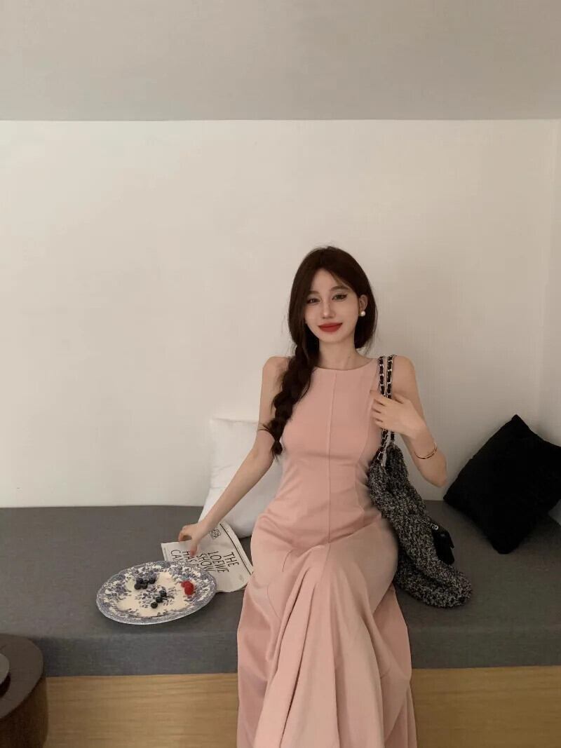 フレンチスイートホットガールノースリーブスリムフィットドレス春純粋セクシーOネックAラインロングドレス 大人ガーリー スウィート キュート カジュアル スプリング 春物 ピュア