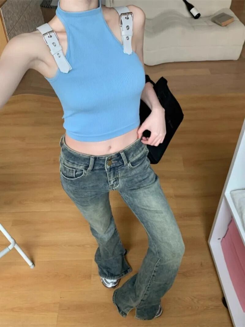 スイートホットガールブルーネックホルターベストストラップ付きレディース春スリムフィットノースリーブショートトップ 大人ガーリー スウィート キュート カジュアル スプリング 春物