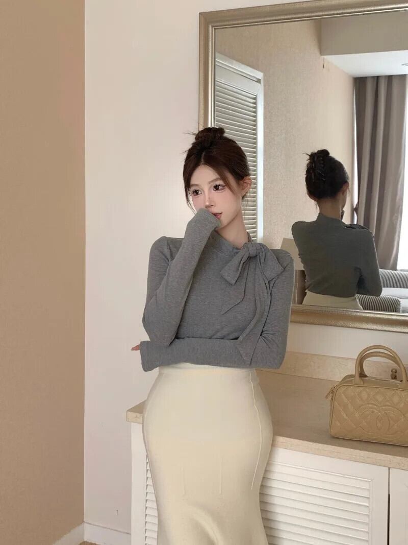 フレンチスイートホットガールリボン長袖Tシャツ春スリムフィットレースアップボトムハーフネックトップ ロング 大人ガーリー スウィート キュート カジュアル スプリング 春物