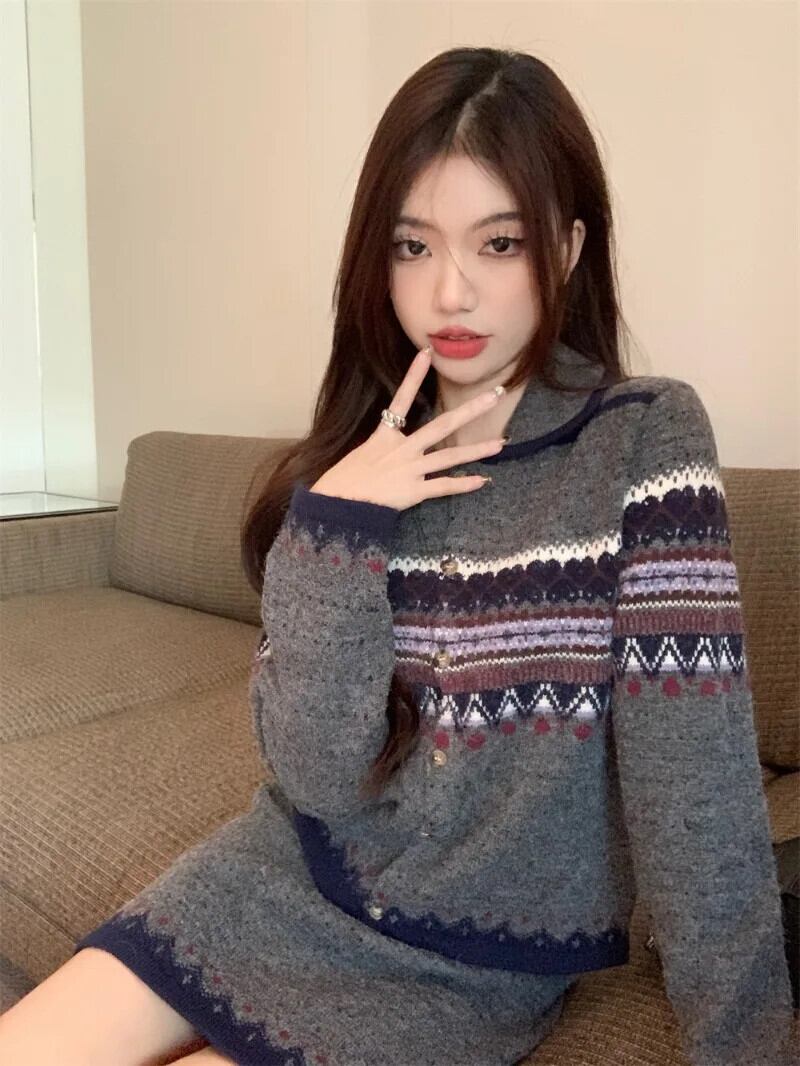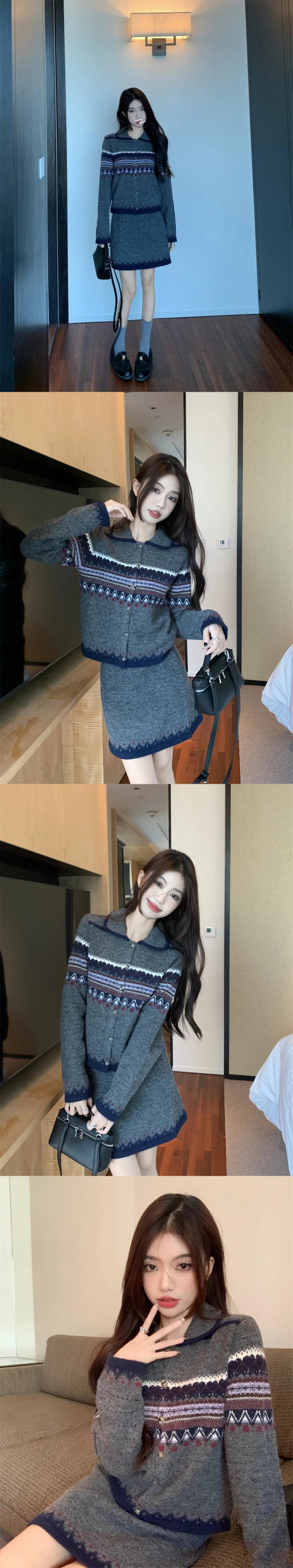甘いホットガールレトロスーツ春ジャカードニットカーディガンウエストミニスカートツーピースセット 大人ガーリー スウィート キュート カジュアル スプリング 春物