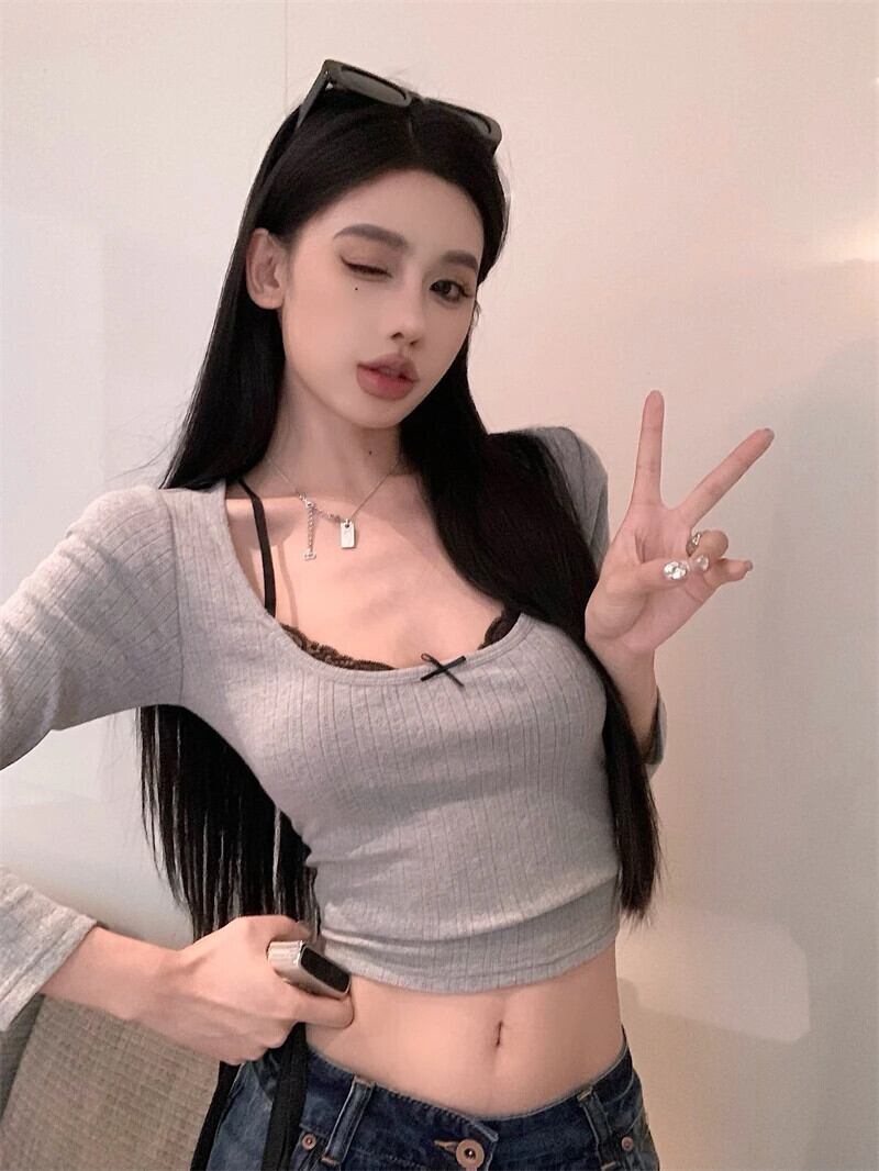 甘いホットガールグレーフェイクツーピースニットシャツ春レース O ネック長袖タイトショートトップ ロング 大人ガーリー スウィート キュート カジュアル スプリング 春物 Oネック