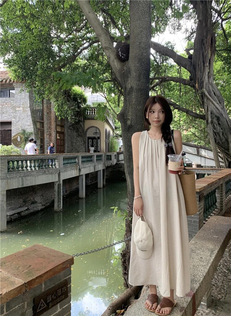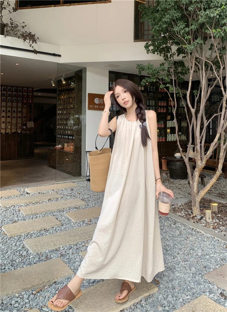 甘いホットガールルーズソリッドカラードレス夏ノースリーブ O ネック A ラインロングドレス 大人ガーリー スウィート キュート カジュアル サマー 夏物 Oネック Aライン