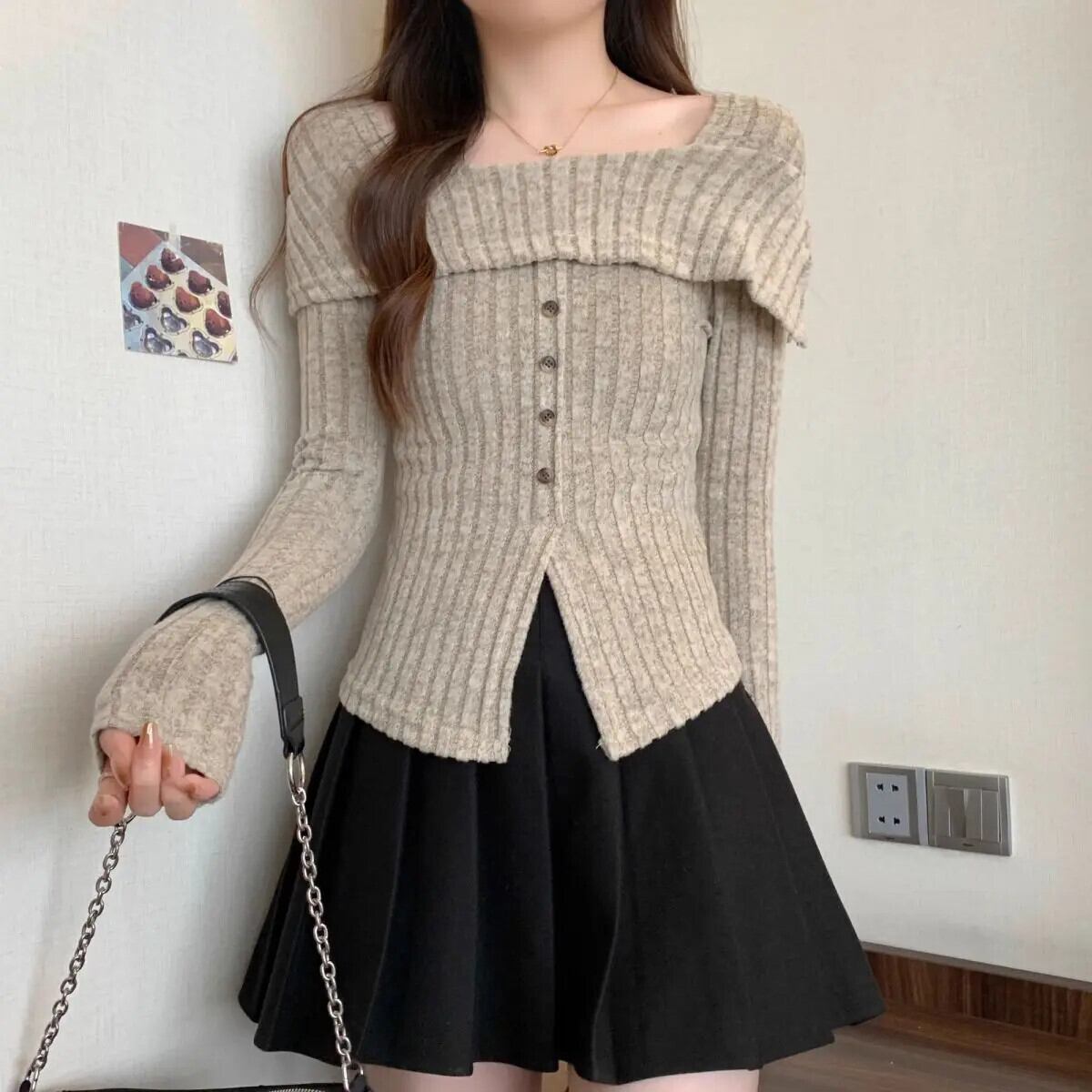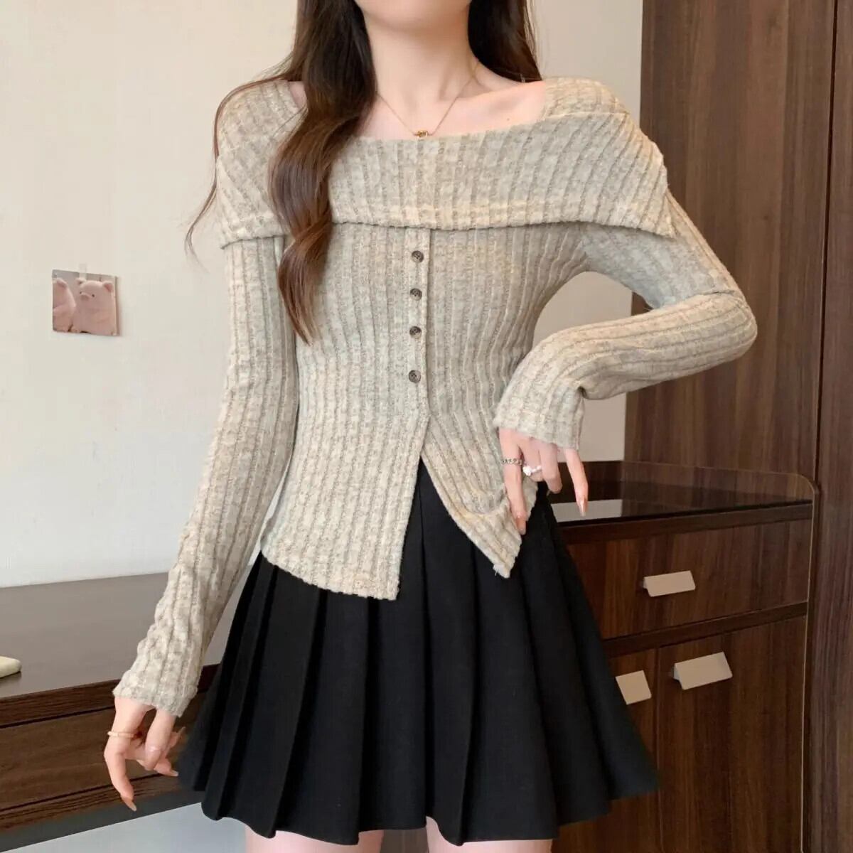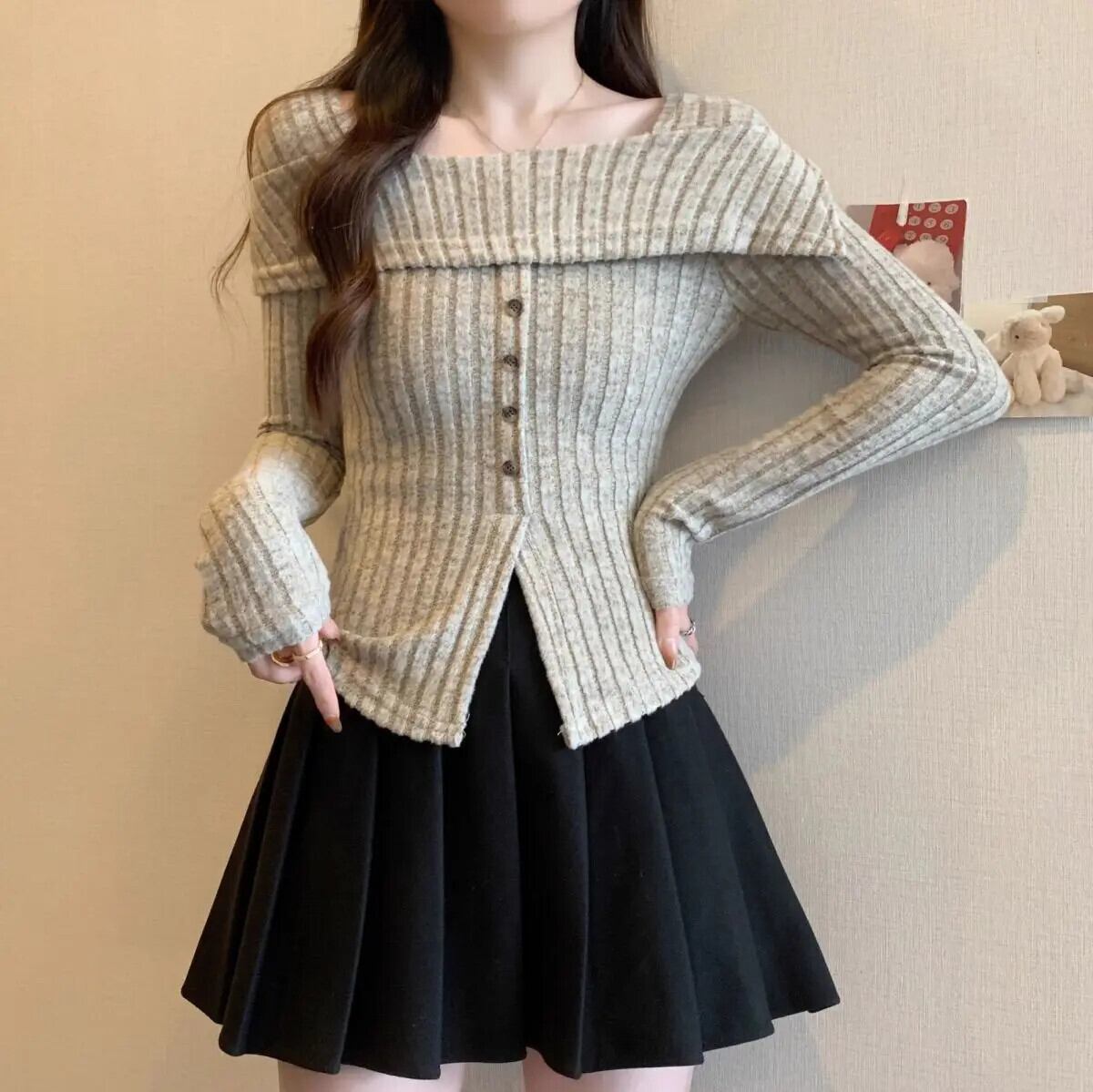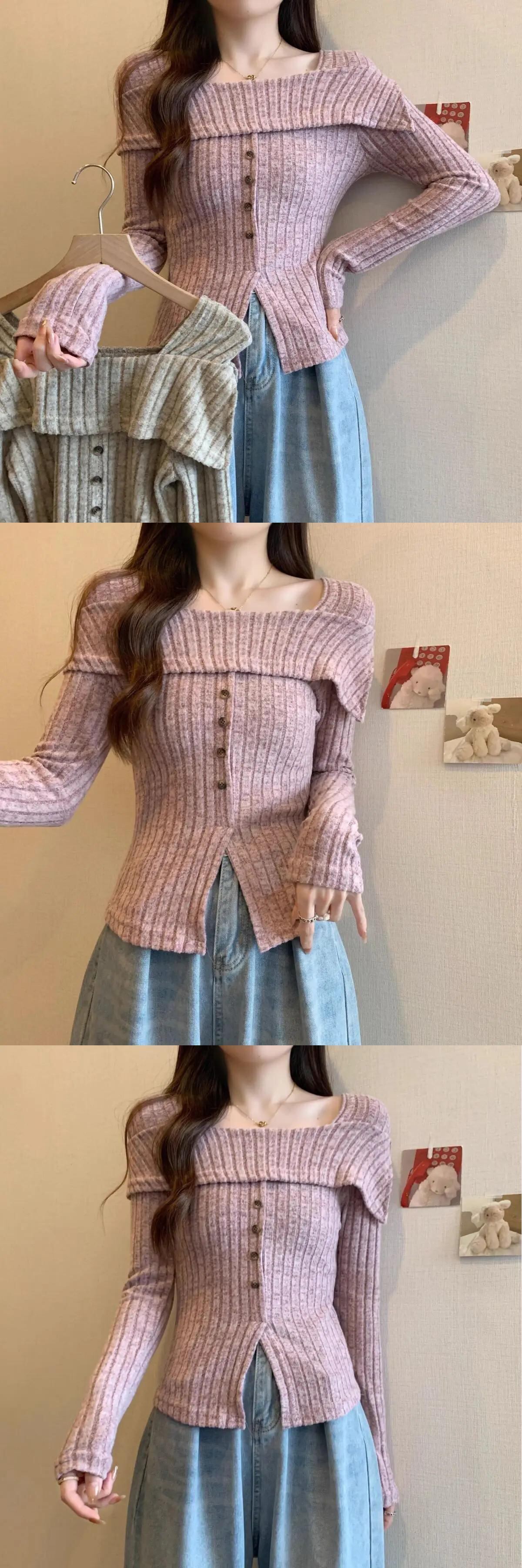 甘いホットガールオフショルダーニットシャツ春と秋長袖スリムフィットセーター ロング 大人ガーリー スウィート キュート カジュアル スプリング 春物 オータム 秋物