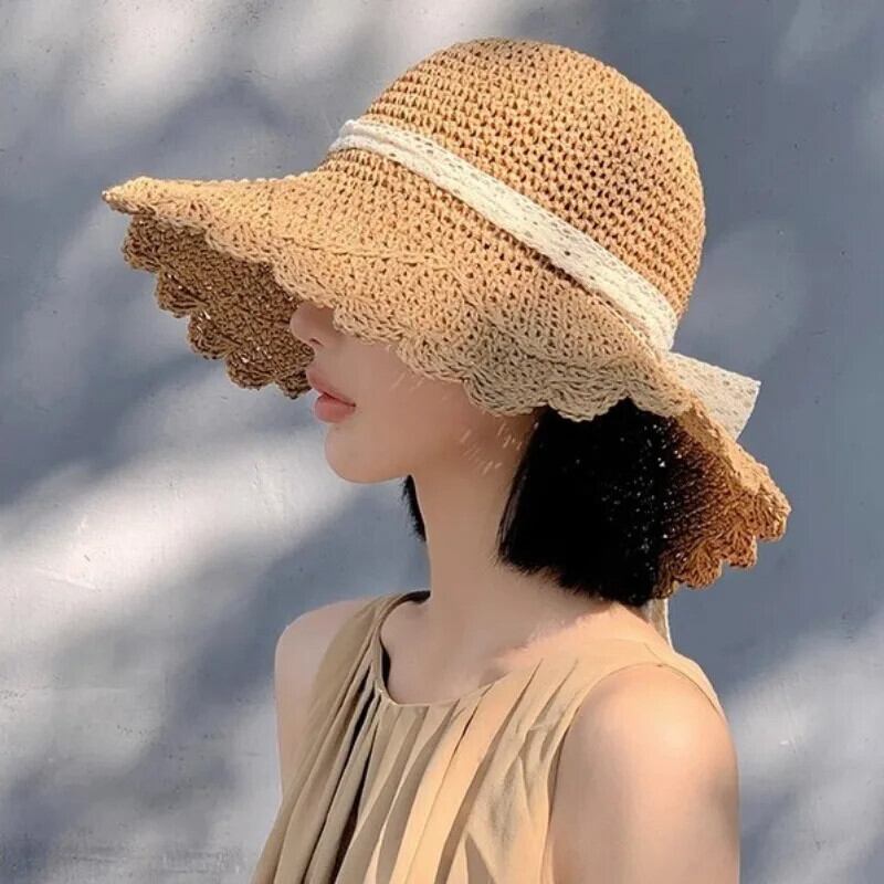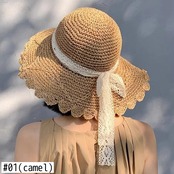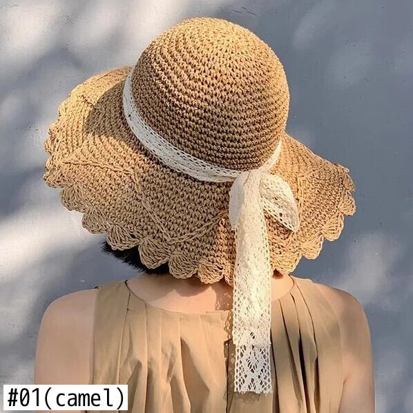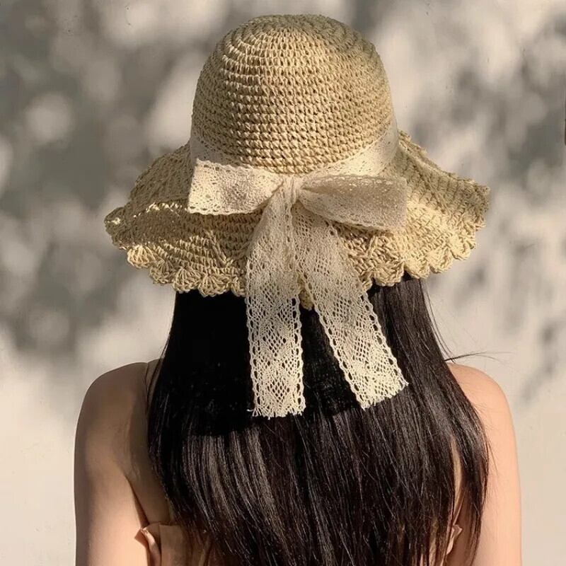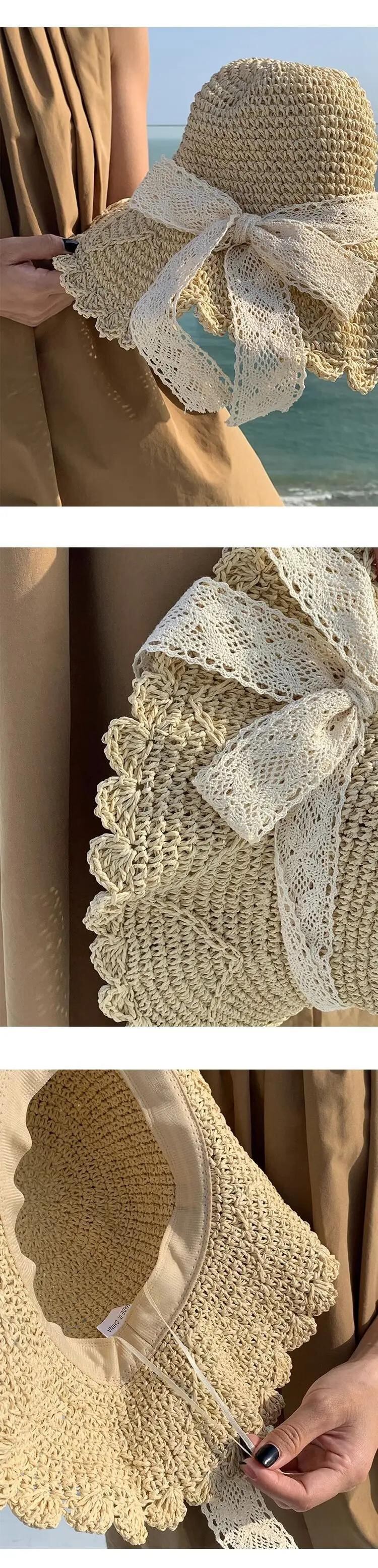 甘いホットガール弓わらレースバケットハット夏ビーチ日よけ大きつばバケットハットトレンディアクセサリー リボン 帽子 大人ガーリー スウィート キュート カジュアル サマー 夏物