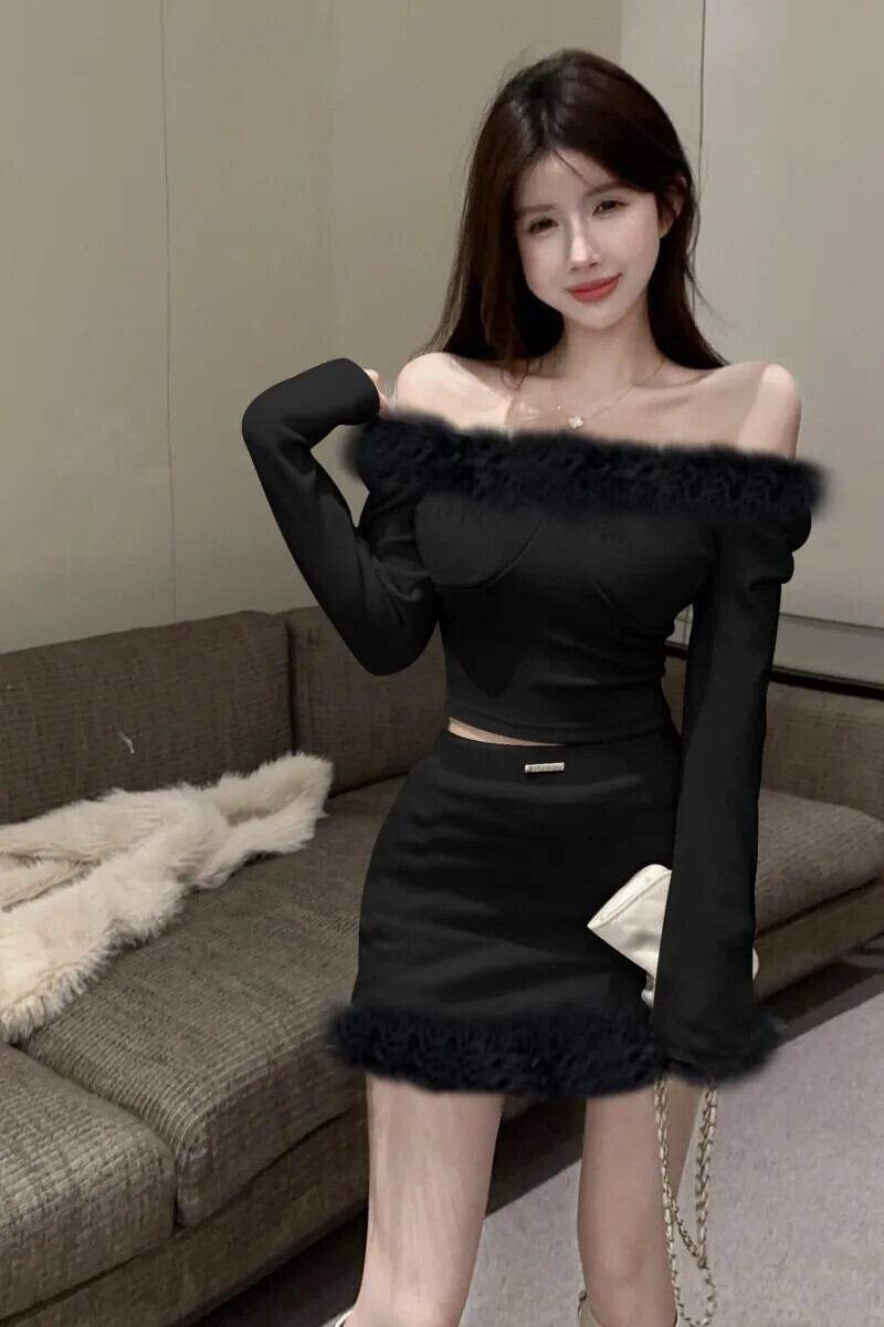純粋セクシーホットガールスーツ秋/冬オフショルダーファー襟スリムショートトップラップヒップミニスカートツーピースセット オータム 秋物 ウィンター 冬物