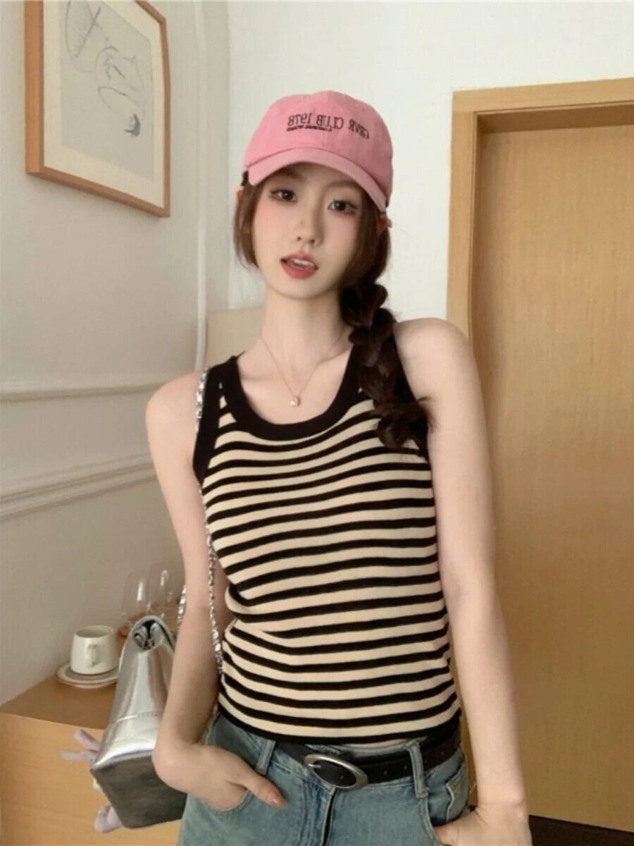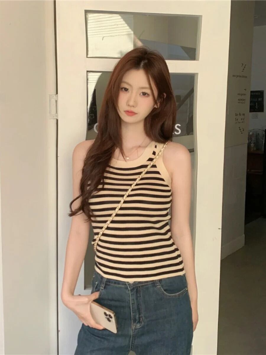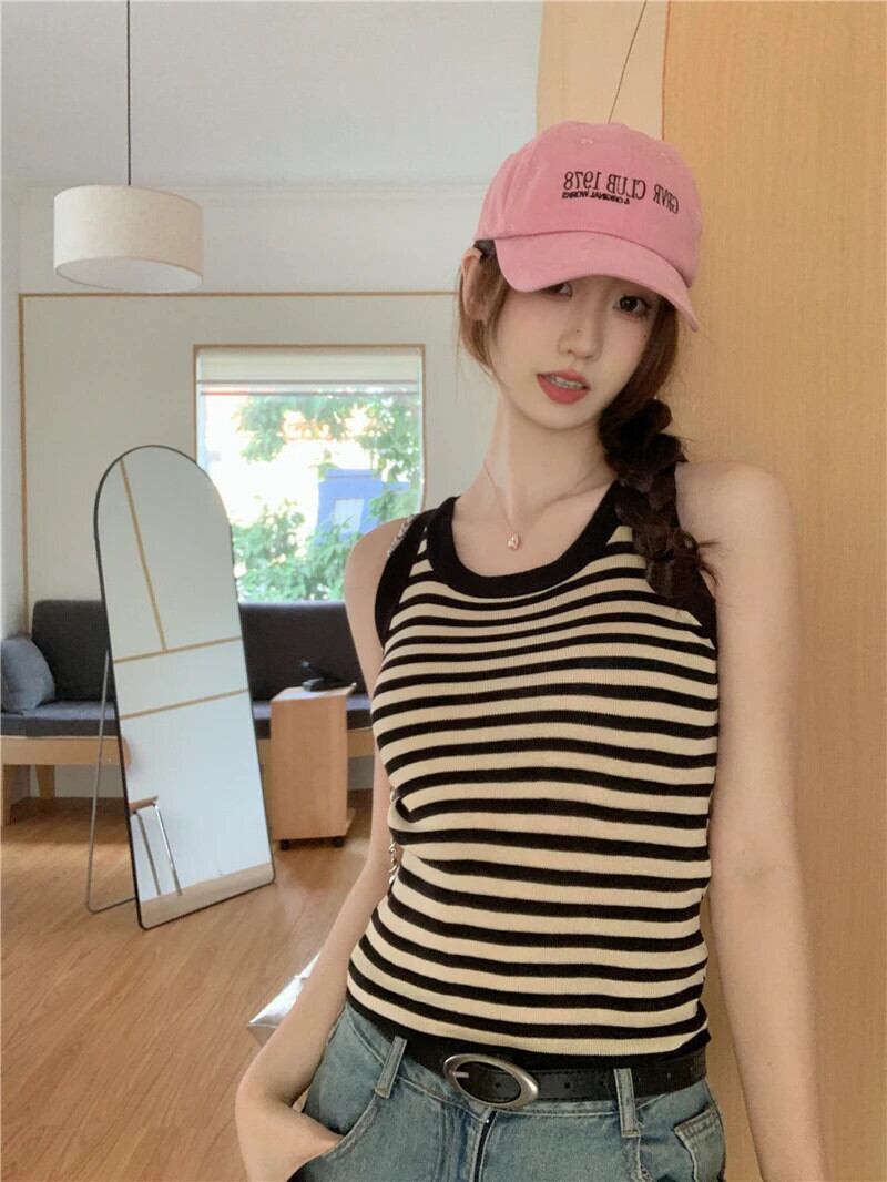 甘いホットガールコントラストストライプノースリーブベスト春スリムフィットショートストラップニットトップ 大人ガーリー スウィート キュート カジュアル スプリング 春物