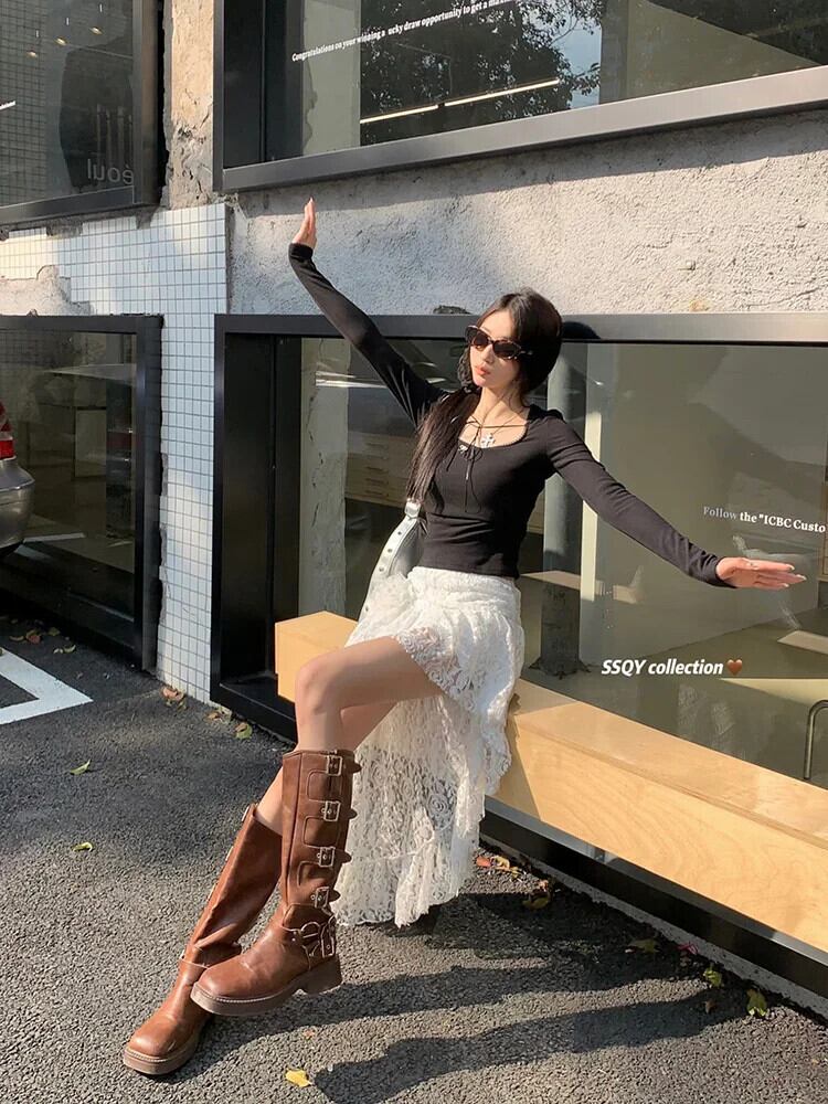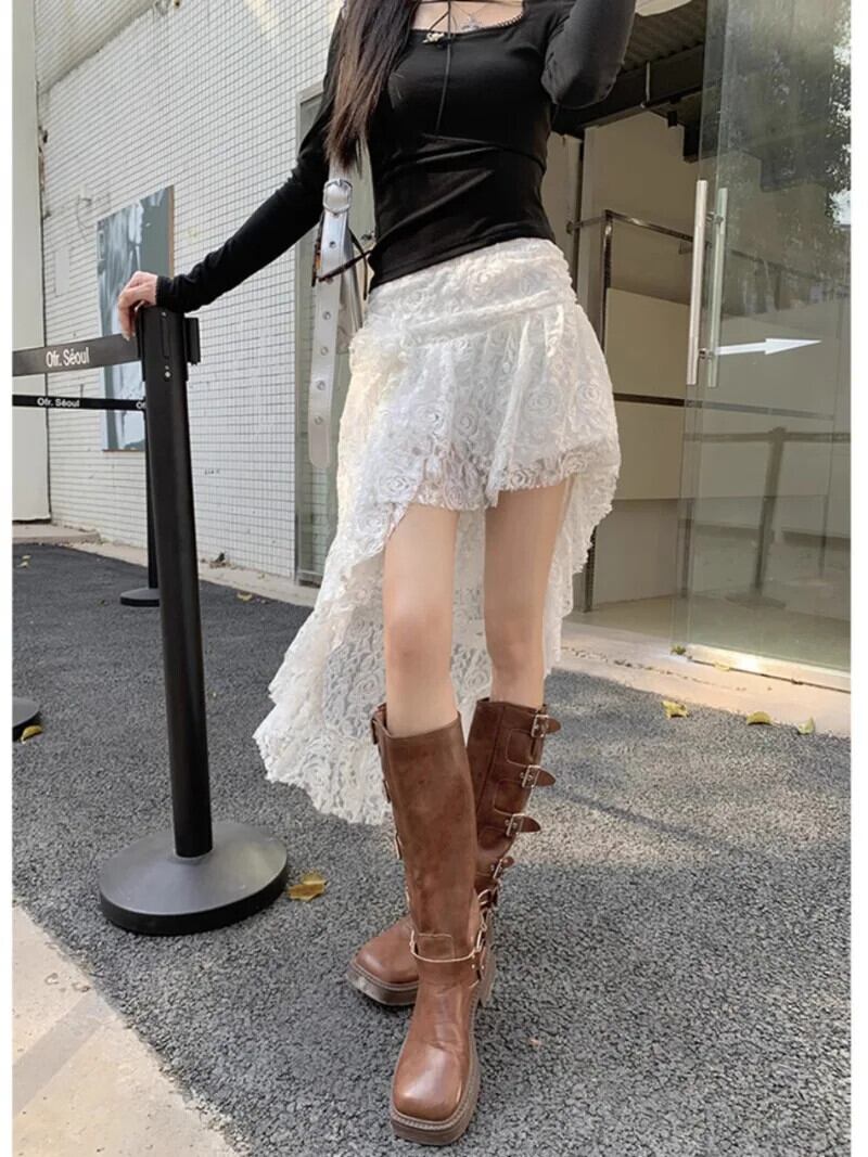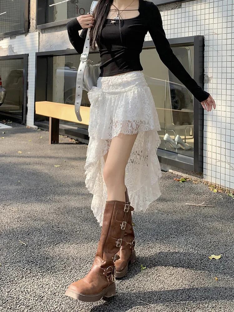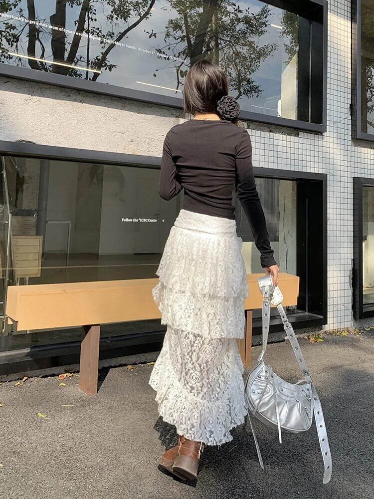 甘いホットガール不規則レーススカート春ホワイトケーキウエストミッドレングス A ラインスカート 大人ガーリー スウィート キュート カジュアル スプリング 春物 Aライン